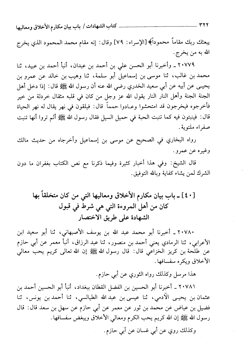 20779 - وَأَخْبَرَنَا أَبُو الْحَسَنِ عَلِيُّ بْنُ أَحْمَدَ بْنِ عَبْدَانَ , أنبأ أَحْمَدُ بْنُ عُبَيْدٍ , ثنا مُحَمَّدُ بْنُ غَالِبٍ , ثنا مُوسَى بْنُ إِسْمَاعِيلَ أَبُو سَلَمَةَ , ثنا وُهَيْبُ بْنُ خَالِدٍ , عَنْ عَمْرِو بْنِ يَحْيَى , عَنْ أَبِيهِ , عَنْ أَبِي سَعِيدٍ الْخُدْرِيِّ , رَضِيَ اللهُ عَنْهُ أَنَّ رَسُولَ اللهِ صَلَّى اللهُ عَلَيْهِ وَسَلَّمَ قَالَ: §" إِذَا دَخَلَ أَهْلُ الْجَنَّةِ الْجَنَّةَ وَأَهْلُ النَّارِ النَّارَ يَقُولُ اللهُ عَزَّ وَجَلَّ: مَنْ كَانَ فِي قَلْبِهِ مِثْقَالُ خَرْدَلَةٍ مِنْ خَيْرٍ فَأَخْرِجُوهُ , فَيَخْرُجُونَ قَدِ امْتُحِشُوا وَعَادُوا حُمَمًا , قَالَ: فَيُلْقَوْنَ فِي نَهَرٍ يُقَالُ لَهُ نَهَرُ الْحَيَاةِ , قَالَ: فَيَنْبُتُونَ فِيهِ كَمَا تَنْبُتُ الْحَبَّةُ فِي حَمِيلِ السَّيْلِ " , فَقَالَ رَسُولُ اللهِ صَلَّى اللهُ عَلَيْهِ وَسَلَّمَ: " أَلَمْ تَرَوْا أَنَّهَا تَنْبُتُ صَفْرَاءَ مُلْتَوِيَةً ". رَوَاهُ الْبُخَارِيُّ فِي الصَّحِيحِ , عَنْ مُوسَى بْنِ إِسْمَاعِيلَ , وَأَخْرَجَاهُ مِنْ حَدِيثِ مَالِكٍ وَغَيْرِهِ , عَنْ عَمْرٍو. قَالَ الشَّيْخُ: وَفِي هَذَا أَخْبَارٌ كَثِيرَةٌ , وَفِيمَا ذَكَرْنَا مَعَ نَصِّ الْكِتَابِ بِغُفْرَانِ مَا دُونَ الشِّرْكِ لِمَنْ يَشَاءُ كِفَايَةٌ , وَبِاللهِ التَّوْفِيقُ
