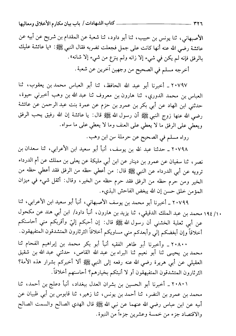 20800 - وَأَخْبَرَنَا أَبُو طَاهِرٍ الْفَقِيهُ , أنبأ أَبُو بَكْرٍ مُحَمَّدُ بْنُ إِبْرَاهِيمَ الْفَحَّامُ , ثنا مُحَمَّدُ بْنُ يَحْيَى , ثنا أَبُو نُعَيْمٍ , ثنا الْبَرَاءُ بْنُ عَبْدِ اللهِ الْقَاصُّ , حَدَّثَنِي عَبْدُ اللهِ بْنُ شَقِيقٍ الْعُقَيْلِيُّ , عَنْ أَبِي هُرَيْرَةَ , رَضِيَ اللهُ عَنْهُ رَفَعَهُ إِلَى النَّبِيِّ صَلَّى اللهُ عَلَيْهِ وَسَلَّمَ: §" أَلَا أُخْبِرُكُمْ بِشِرِارِ هَذِهِ الْأُمَّةِ؟ الثَّرْثَارُونَ الْمُتَشَدِّقُونَ الْمُتَفَيْهِقُونَ , أَوَلَا أُنَبِّئُكُمْ بِخِيَارِهِمْ؟ أَحَاسِنُهُمْ أَخْلَاقًا "