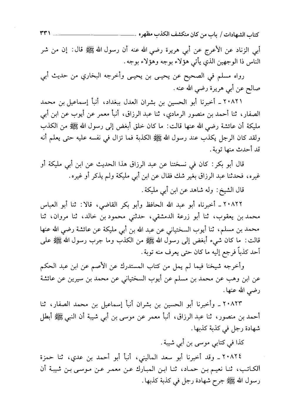 20823 - وَأَخْبَرَنَا أَبُو الْحُسَيْنُ بْنُ بِشْرَانَ , أنبأ إِسْمَاعِيلُ بْنُ مُحَمَّدٍ الصَّفَّارُ , ثنا أَحْمَدُ بْنُ مَنْصُورٍ , ثنا عَبْدُ الرَّزَّاقِ , أنبأ مَعْمَرٌ , عَنْ مُوسَى بْنِ أَبِي شَيْبَةَ , أَنَّ النَّبِيَّ صَلَّى اللهُ عَلَيْهِ وَسَلَّمَ §أَبْطَلَ شَهَادَةَ رَجُلٍ فِي كِذْبَةٍ كَذِبَهَا ". كَذَا فِي كِتَابِي: مُوسَى بْنُ أَبِي شَيْبَةَ