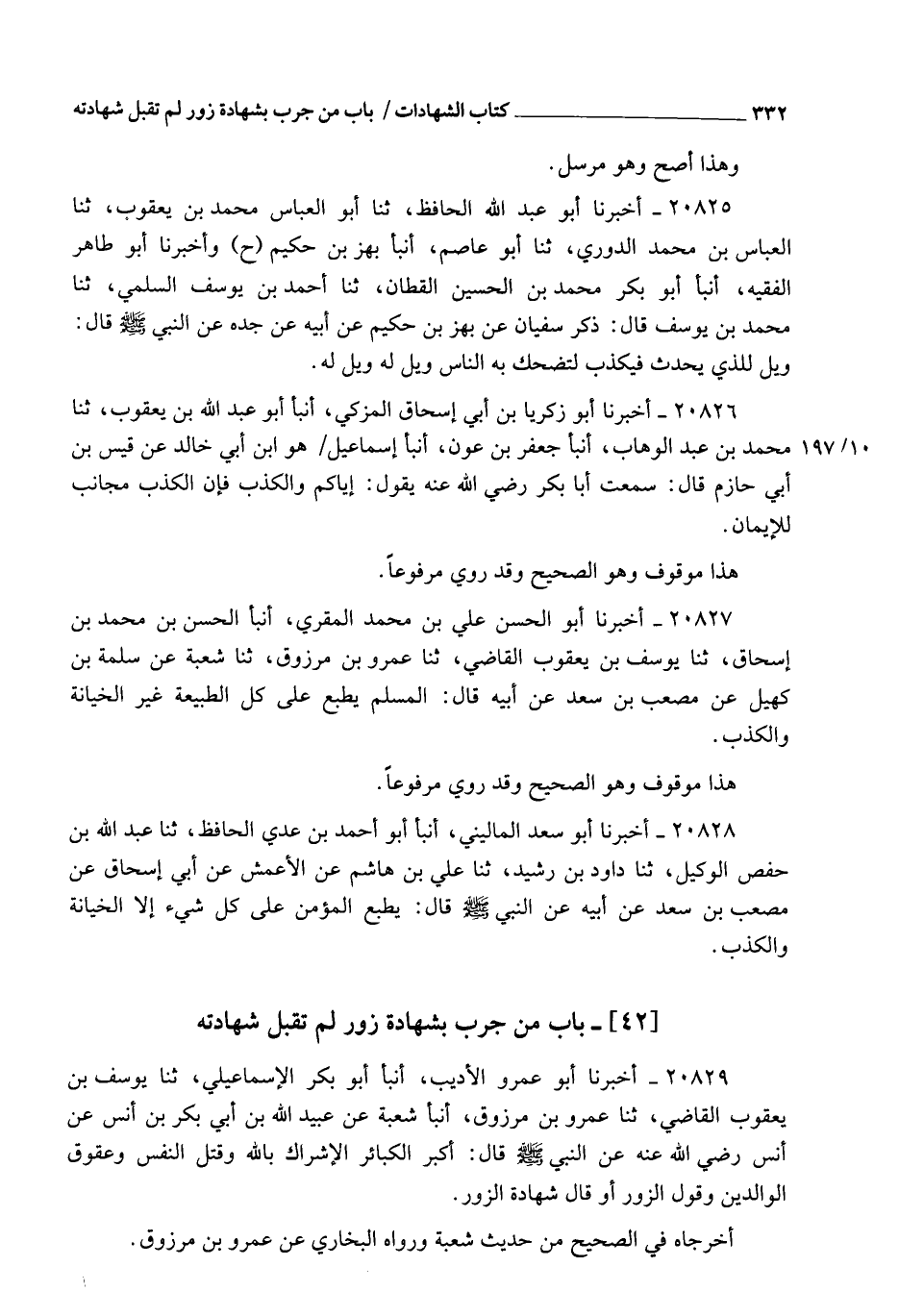 20829 - أَخْبَرَنَا أَبُو عَمْرٍو الْأَدِيبُ , أنبأ أَبُو بَكْرٍ الْإِسْمَاعِيلِيُّ , ثنا يُوسُفُ بْنُ يَعْقُوبَ الْقَاضِي , ثنا عَمْرُو بْنُ مَرْزُوقٍ , أنبأ شُعْبَةُ , عَنْ عُبَيْدِ اللهِ بْنِ أَبِي بَكْرِ بْنِ أَنَسٍ , عَنْ أَنَسٍ , رَضِيَ اللهُ عَنْهُ , عَنِ النَّبِيِّ صَلَّى اللهُ عَلَيْهِ وَسَلَّمَ قَالَ: §" أَكْبَرُ الْكَبَائِرِ الْإِشْرَاكُ بِاللهِ , وَقَتْلُ النَّفْسِ , وَعُقُوقُ الْوَالِدَيْنِ , وَقَوْلُ الزُّورِ " أَوْ قَالَ: " شَهَادَةُ الزُّورِ ". أَخْرَجَاهُ فِي الصَّحِيحِ مِنْ حَدِيثِ شُعْبَةَ , وَرَوَاهُ الْبُخَارِيُّ , عَنْ عَمْرِو بْنِ مَرْزُوقٍ