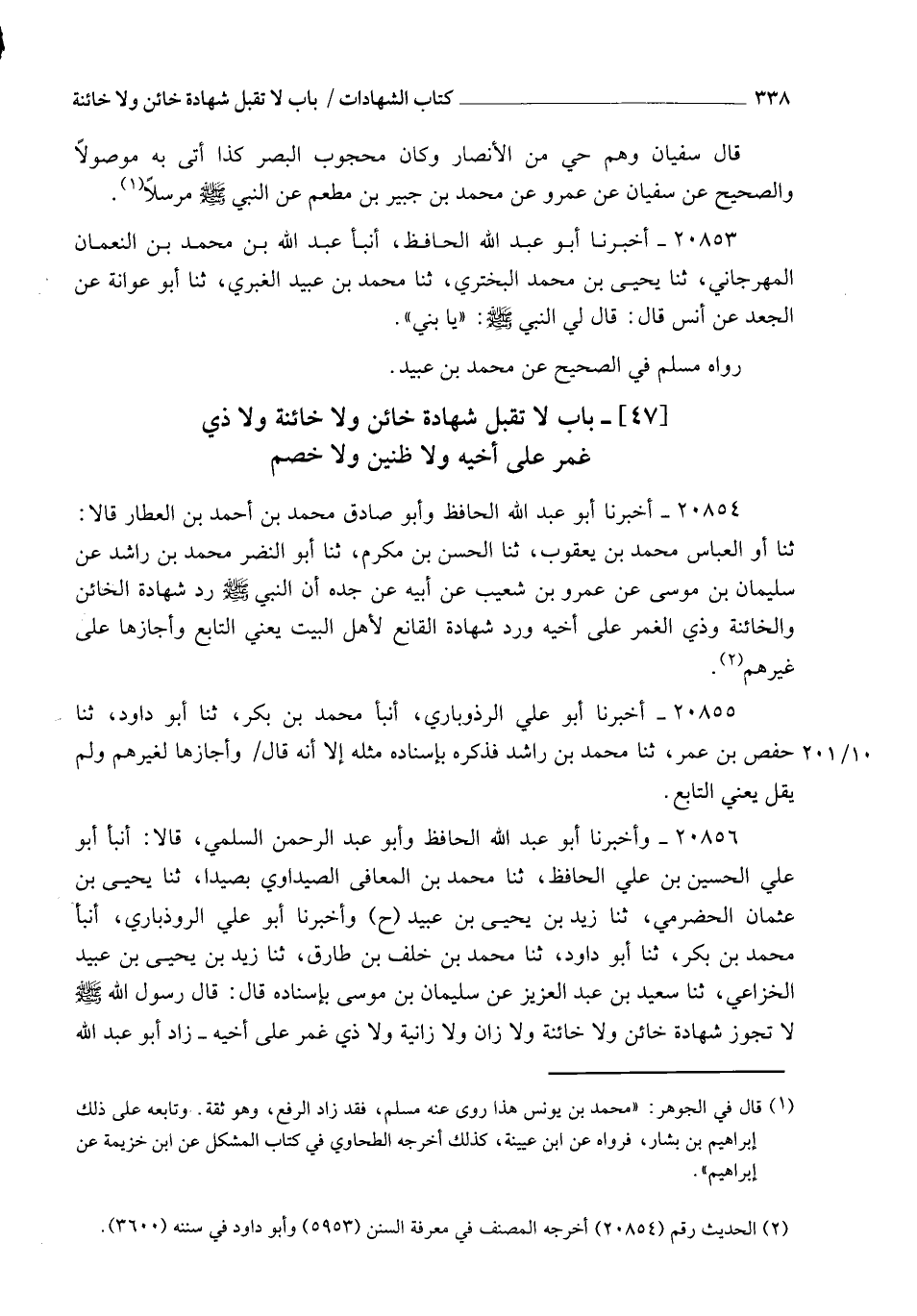 20854 - أَخْبَرَنَا أَبُو عَبْدِ اللهِ الْحَافِظُ , وَأَبُو صَادِقٍ مُحَمَّدُ بْنُ أَحْمَدَ بْنِ الْعَطَّارِ قَالَا: ثنا أَبُو الْعَبَّاسِ مُحَمَّدُ بْنُ يَعْقُوبَ , ثنا الْحَسَنُ بْنُ مُكْرَمٍ , ثنا أَبُو النَّضْرِ مُحَمَّدُ بْنُ رَاشِدٍ , عَنْ سُلَيْمَانَ بْنِ مُوسَى , عَنْ عَمْرِو بْنِ شُعَيْبٍ , عَنْ أَبِيهِ , عَنْ جَدِّهِ , أَنَّ النَّبِيَّ صَلَّى اللهُ عَلَيْهِ وَسَلَّمَ: §رَدَّ شَهَادَةَ الْخَائِنِ وَالْخَائِنَةِ وَذِي الْغِمْرِ عَلَى أَخِيهِ , وَرَدَّ شَهَادَةَ الْقَانِعِ لِأَهْلِ الْبَيْتِ , يَعْنِي التَّابِعَ , وَأَجَازَهَا عَلَى غَيْرِهِمْ ".