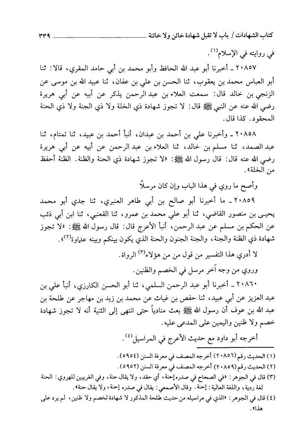 20860 - أَخْبَرَنَا أَبُو عَبْدِ الرَّحْمَنِ السُّلَمِيُّ , ثنا أَبُو الْحَسَنِ الْكَارِزِيُّ , أنبأ عَلِيُّ بْنُ عَبْدِ الْعَزِيزِ , عَنْ أَبِي عُبَيْدٍ , ثنا حَفْصُ بْنُ غِيَاثٍ , عَنْ مُحَمَّدِ بْنِ زَيْدِ بْنِ مُهَاجِرٍ , عَنْ طَلْحَةَ بْنِ عَبْدِ اللهِ بْنِ عَوْفٍ , أَنَّ رَسُولَ اللهِ صَلَّى اللهُ عَلَيْهِ وَسَلَّمَ بَعَثَ مُنَادِيًا حَتَّى انْتَهَى إِلَى الثَّنِيَّةِ: §" أَنَّهُ لَا تَجُوزُ شَهَادَةُ خَصْمٍ وَلَا ظَنِينٍ , وَالْيَمِينُ عَلَى الْمُدَّعَى عَلَيْهِ " أَخْرَجَهُ أَبُو دَاوُدَ مَعَ حَدِيثِ الْأَعْرَجِ فِي الْمَرَاسِيلِ