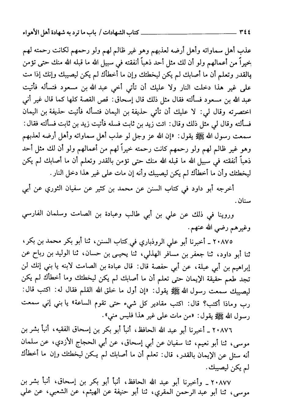 20876 - أَخْبَرَنَا أَبُو عَبْدِ اللهِ الْحَافِظُ , أنبأ أَبُو بَكْرِ بْنُ إِسْحَاقَ الْفَقِيهُ , أنبأ بِشْرُ بْنُ مُوسَى , ثنا أَبُو نُعَيْمٍ , ثنا سُفْيَانُ , عَنْ أَبِي إِسْحَاقَ , عَنْ أَبِي الْحَجَّاجِ الْأَزْدِيِّ , عَنْ سَلْمَانَ , أَنَّهُ سُئِلَ عَنِ الْإِيمَانِ بِالْقَدَرِ , قَالَ: تَعْلَمُ أَنَّ §مَا أَصَابَكَ لَمْ يَكُنْ لِيُخْطِئَكَ , وَأَنَّ مَا أَخْطَأَكَ لَمْ يَكُنْ لِيُصِيبَكَ "