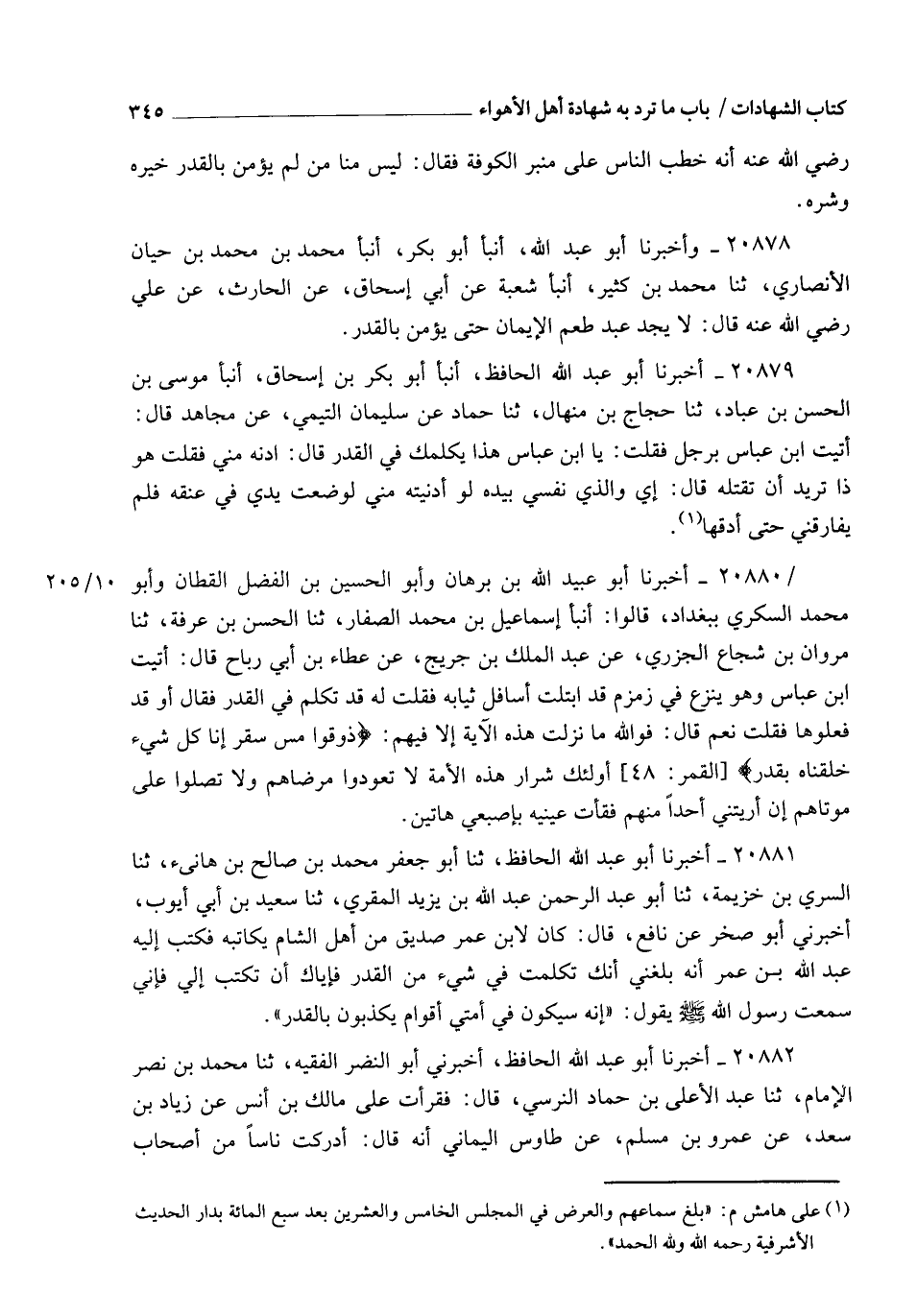 20881 - أَخْبَرَنَا أَبُو عَبْدِ اللهِ الْحَافِظُ , ثنا أَبُو جَعْفَرٍ مُحَمَّدُ بْنُ صَالِحِ بْنِ هَانِئٍ , ثنا السَّرِيُّ بْنُ خُزَيْمَةَ , ثنا أَبُو عَبْدِ الرَّحْمَنِ عَبْدُ اللهِ بْنُ يَزِيدَ الْمُقْرِئُ , ثنا سَعِيدُ بْنُ أَبِي أَيُّوبَ , أَخْبَرَنِي أَبُو صَخْرٍ , عَنْ نَافِعٍ , قَالَ: كَانَ لِابْنِ عُمَرَ صَدِيقٌ مِنْ أَهْلِ الشَّامِ يُكَاتِبُهُ , فَكَتَبَ إِلَيْهِ عَبْدُ اللهِ بْنُ عُمَرَ: إِنَّهُ بَلَغَنِي أَنَّكَ تَكَلَّمْتَ فِي شَيْءٍ مِنَ الْقَدَرِ , فَإِيَّاكَ أَنْ تَكْتُبَ إِلِيَّ , فَإِنِّي سَمِعْتُ رَسُولَ اللهِ صَلَّى اللهُ عَلَيْهِ وَسَلَّمَ يَقُولُ: §" إِنَّهُ سَيَكُونُ فِي أُمَّتِي أَقْوَامٌ يُكَذِّبُونَ بِالْقَدَرِ "