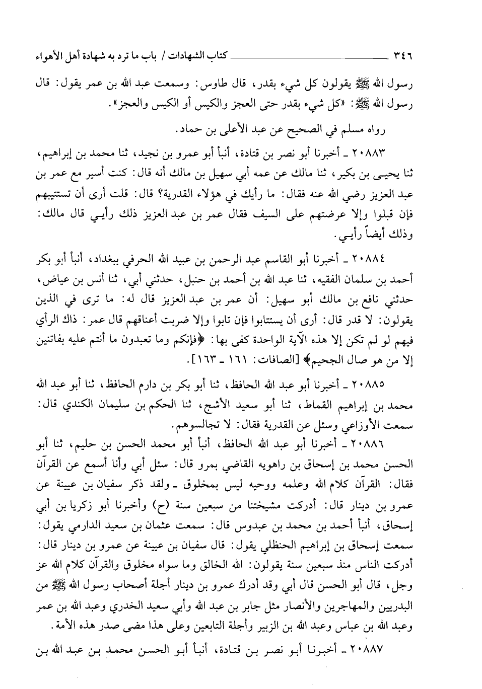 20884 - أَخْبَرَنَا أَبُو الْقَاسِمِ عَبْدُ الرَّحْمَنِ بْنُ عُبَيْدِ اللهِ الْحُرْفِيُّ , بِبَغْدَادَ , أنبأ أَبُو بَكْرٍ أَحْمَدُ بْنُ سَلْمَانَ الْفَقِيهُ , ثنا عَبْدُ اللهِ بْنُ أَحْمَدَ بْنِ حَنْبَلٍ , حَدَّثَنِي أَبِي , ثنا أَنَسُ بْنُ عِيَاضٍ , حَدَّثَنِي نَافِعُ بْنُ مَالِكٍ أَبُو سُهَيْلٍ , أَنَّ عُمَرَ بْنَ عَبْدِ الْعَزِيزِ , قَالَ لَهُ: " مَا تَرَى فِي الَّذِينَ يَقُولُونَ: لَا قَدَرَ؟ " , قَالَ: §أَرَى أَنْ يُسْتَتَابُوا , فَإِنْ تَابُوا وَإِلَّا ضَرَبْتَ أَعْنَاقَهُمْ , قَالَ عُمَرُ: " ذَاكَ الرَّأْيُ فِيهِمْ , لَوْ لَمْ تَكُنْ إِلَّا هَذِهِ الْآيَةُ الْوَاحِدَةُ كَفَى بِهَا {فَإِنَّكُمْ وَمَا تَعْبُدُونَ مَا أَنْتُمْ عَلَيْهِ بِفَاتِنِينَ إِلَّا مَنْ هُوَ صَالِ الْجَحِيمِ} [الصافات: 162] "
