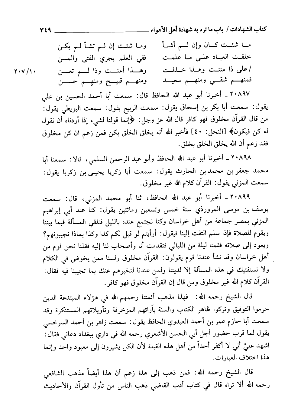 20898 - أَخْبَرَنَا أَبُو عَبْدِ اللهِ الْحَافِظُ , وَأَبُو عَبْدِ الرَّحْمَنِ السُّلَمِيُّ , قَالَا: سَمِعْنَا أَبَا مُحَمَّدٍ جَعْفَرَ بْنَ مُحَمَّدِ بْنِ الْحَارِثِ يَقُولُ: سَمِعْتُ أَبَا زَكَرِيَّا يَحْيَى بْنَ زَكَرِيَّا يَقُولُ: سَمِعْتُ الْمُزَنِيَّ , يَقُولُ: §" الْقُرْآنُ كَلَامُ اللهِ غَيْرُ مَخْلُوقٍ "