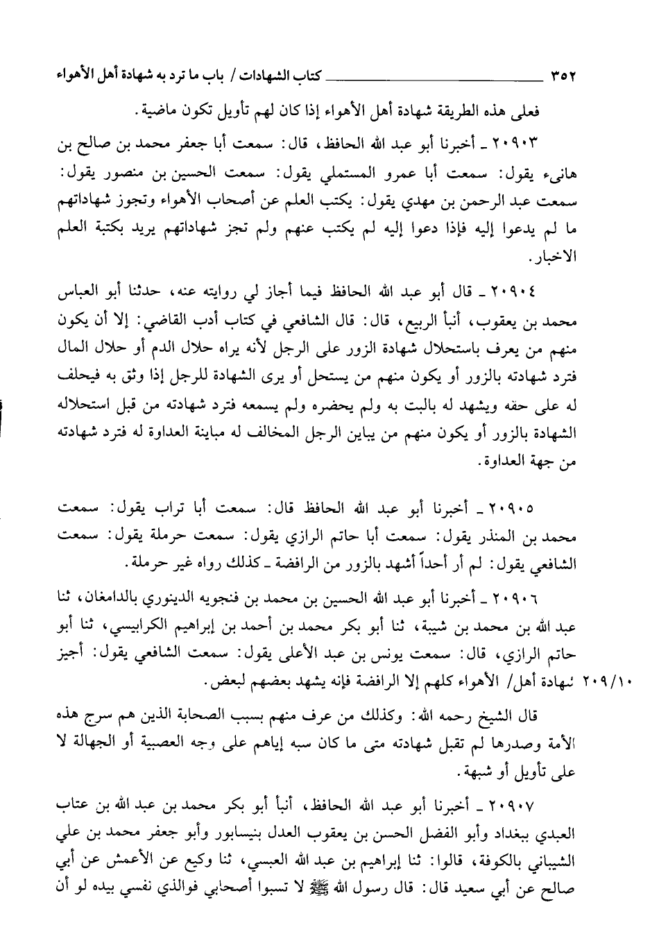 20906 - أَخْبَرَنَا أَبُو عَبْدِ اللهِ الْحُسَيْنُ بْنُ مُحَمَّدِ بْنِ فَنْجَوَيْهِ الدَّيْنَوَرِيُّ , بِالدَّامِغَانِ , ثنا عَبْدُ اللهِ بْنُ مُحَمَّدِ بْنِ شَيْبَةَ , ثنا أَبُو بَكْرٍ مُحَمَّدُ بْنُ أَحْمَدَ بْنِ إِبْرَاهِيمَ الْكَرَابِيسِيُّ , ثنا أَبُو حَاتِمٍ الرَّازِيُّ , قَالَ: سَمِعْتُ يُونُسَ بْنَ عَبْدِ الْأَعْلَى , يَقُولُ: سَمِعْتُ الشَّافِعِيَّ , يَقُولُ: §" أُجِيزُ شَهَادَةَ أَهْلِ الْأَهْوَاءِ كُلِّهِمْ إِلَّا الرَّافِضَةَ , فَإِنَّهُ يَشْهَدُ بَعْضُهُمْ لِبَعْضٍ ". قَالَ الشَّيْخُ رَحِمَهُ اللهُ: " وَكَذَلِكَ مَنْ عُرِفَ مِنْهُمْ بِسَبِّ الصَّحَابَةِ الَّذِينَ هُمْ سُرُجُ هَذِهِ الْأُمَّةِ وَصَدْرُهَا لَمْ تُقْبَلْ شَهَادَتُهُ مَتَى مَا كَانَ سَبُّهُ إِيَّاهُمْ عَلَى وَجْهِ الْعَصَبِيَّةِ , أَوِ الْجَهَالَةِ لَا عَلَى تَأْوِيلٍ أَوْ شُبْهَةٍ "