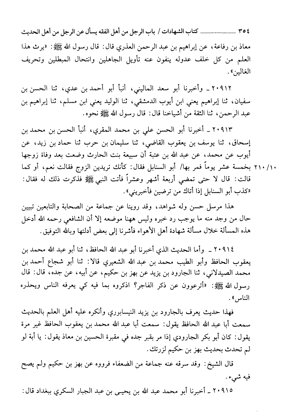 20913 - أَخْبَرَنَا أَبُو الْحَسَنِ عَلِيُّ بْنُ مُحَمَّدٍ الْمُقْرِئُ , أنبأ الْحَسَنُ بْنُ مُحَمَّدِ بْنِ إِسْحَاقَ , ثنا يُوسُفُ بْنُ يَعْقُوبَ الْقَاضِي , ثنا سُلَيْمَانُ بْنُ حَرْبٍ , ثنا حَمَّادُ بْنُ زَيْدٍ , عَنْ أَيُّوبَ , عَنْ مُحَمَّدٍ , عَنْ عَبْدِ اللهِ بْنِ عُتْبَةَ , أَنَّ سُبَيْعَةَ بِنْتَ الْحَارِثِ وَضَعَتْ بَعْدَ وَفَاةِ زَوْجِهَا بِخَمْسَةَ عَشَرَ يَوْمًا , فَمَرَّ بِهَا أَبُو السَّنَابِلِ فَقَالَ: كَأَنَّكِ تُرِيدِينَ الزَّوْجَ؟ فَقَالَتْ: نَعَمْ , أَوْ كَمَا قَالَتْ , قَالَ: لَا حَتَّى تَمْضِي أَرْبَعَةُ أَشْهُرٍ وَعَشْرًا , فَأَتَتِ النَّبِيَّ صَلَّى اللهُ عَلَيْهِ وَسَلَّمَ فَذَكَرَتْ ذَلِكَ لَهُ , فَقَالَ: " كَذَبَ أَبُو السَّنَابِلِ , §إِذَا أَتَاكِ مَنْ تَرْضَيْنَ فَأَخْبِرِينِي ". هَذَا مُرْسَلٌ حَسَنٌ , وَلَهُ شَوَاهِدُ , وَقَدْ رُوِّينَا عَنْ جَمَاعَةٍ مِنَ الصَّحَابَةِ وَالتَّابِعِينَ تَبْيِينَ حَالِ مَنْ وُجِدَ مِنْهُ مَا يُوجِبُ رَدَّ خَبَرِهِ , لَيْسَ هَهُنَا مَوْضِعُهُ , إِلَّا أَنَّ الشَّافِعِيَّ رَحِمَهُ اللهُ أَدْخَلَ هَذِهِ الْمَسْأَلَةَ خِلَالَ مَسْأَلَةِ شَهَادَةِ أَهْلِ الْأَهْوَاءِ , فَأَشَرْنَا إِلَى بَعْضِ أَدِلَّتِهَا , وَبِاللهِ التَّوْفِيقُ