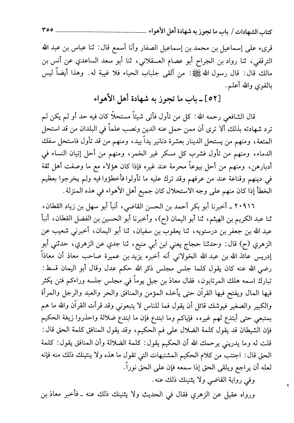 20916 - أَخْبَرَنَا أَبُو بَكْرٍ أَحْمَدُ بْنُ الْحَسَنِ الْقَاضِي , أنبأ أَبُو سَهْلِ بْنُ زِيَادٍ الْقَطَّانُ , ثنا عَبْدُ الْكَرِيمِ بْنُ الْهَيْثَمِ , ثنا أَبُو الْيَمَانِ ح وَأَخْبَرَنَا أَبُو الْحُسَيْنِ بْنُ الْفَضْلِ الْقَطَّانُ , أنبأ عَبْدُ اللهِ بْنُ جَعْفَرِ بْنِ دَرَسْتَوَيْهِ , ثنا يَعْقُوبُ بْنُ سُفْيَانَ , ثنا أَبُو الْيَمَانِ , أَخْبَرَنِي شُعَيْبٌ , عَنِ الزُّهْرِيِّ، ح، قَالَ: وَحَدَّثَنَا حَجَّاجٌ , يَعْنِي: ابْنَ أَبِي مَنِيعٍ , ثنا جَدِّي , عَنِ الزُّهْرِيِّ , حَدَّثَنِي أَبُو إِدْرِيسَ عَائِذُ اللهِ بْنُ عَبْدِ اللهِ الْخَوْلَانِيُّ أَنَّهُ أَخْبَرَهُ يَزِيدُ بْنُ عُمَيْرَةَ صَاحِبُ مُعَاذٍ أَنَّ مُعَاذًا , رَضِيَ اللهُ عَنْهُ كَانَ يَقُولُ كُلَّمَا جَلَسَ مَجْلِسَ ذِكْرٍ: " §اللهُ حَكَمٌ عَدْلٌ " , وَقَالَ أَبُو الْيَمَانِ: " قِسْطٌ , تَبَارَكَ اسْمُهُ , هَلَكَ الْمُرْتَابُونَ " , فَقَالَ مُعَاذُ بْنُ جَبَلٍ يَوْمًا فِي مَجْلِسٍ جَلَسَهُ: " وَرَاءَكُمْ فِتَنٌ يَكْثُرُ فِيهَا الْمَالُ , وَيُفْتَحُ فِيهَا الْقُرْآنُ , حَتَّى يَأْخُذَهُ الْمُؤْمِنُ وَالْمُنَافِقُ وَالْحُرُّ وَالْعَبْدُ وَالرَّجُلُ وَالْمَرْأَةُ وَالْكَبِيرُ وَالصَّغِيرُ , فَيُوشِكُ قَائِلٌ أَنْ يَقُولُ: فَمَا لِلنَّاسِ لَا يَتَّبِعُونِي وَقَدْ قَرَأْتُ الْقُرْآنَ؟ واللهِ مَا هُمْ بِمُتَّبِعِيَّ حَتَّى أَبْتَدِعَ لَهُمْ غَيْرَهُ , فَإِيَّاكُمْ وَمَا ابْتُدِعَ , فَإِنَّ مَا ابْتُدِعَ ضَلَالَةٌ , وَاحْذَرُوا زَيْغَةَ الْحَكِيمِ , فَإِنَّ الشَّيْطَانَ قَدْ يَقُولُ كَلِمَةَ الضَّلَالِ عَلَى فَمِ الْحَكِيمِ , وَقَدْ يَقُولُ الْمُنَافِقُ كَلِمَةَ الْحَقِّ " , قَالَ: قُلْتُ لَهُ: وَمَا يُدْرِينِي , يَرْحَمُكَ اللهُ , أَنَّ الْحَكِيمَ يَقُولُ كَلِمَةَ الضَّلَالَةِ , وَأَنَّ الْمُنَافِقَ يَقُولُ كَلِمَةَ الْحَقِّ؟ قَالَ: " اجْتَنِبْ مِنْ كَلَامِ الْحَكِيمِ الْمُشْتَبِهَاتِ الَّتِي تَقُولُ مَا هَذِهِ؟ وَلَا يُنْئِيَنَّكَ ذَلِكَ مِنْهُ , فَإِنَّهُ لَعَلَّهُ أَنْ يُرَاجِعَ وَيُلَقَّى الْحَقَّ إِذَا سَمِعَهُ , فَإِنَّ عَلَى الْحَقِّ نُورًا ". وَفِي رِوَايَةِ الْقَاضِي: " وَلَا يُثْنِيَنَّكَ ذَلِكَ عَنْهُ " وَرَوَاهُ عُقَيْلٌ , عَنِ الزُّهْرِيِّ فَقَالَ فِي الْحَدِيثِ: " وَلَا يُثْنِيَنَّكَ ذَلِكَ عَنْهُ " فَأَخْبَرَ مُعَاذُ بْنُ -[356]- جَبَلٍ أَنَّ زَيْغَةَ الْحَكِيمِ لَا تُوجِبُ الْإِعْرَاضَ عَنْهُ , وَلَكِنْ يُتْرَكُ مِنْ قَوْلِهِ مَا لَيْسَ عَلَيْهِ نُورٌ , فَإِنَّ عَلَى الْحَقِّ نُورًا , يَعْنِي - وَاللهُ أَعْلَمُ - دَلَالَةً مِنْ كِتَابٍ , أَوْ سُنَّةٍ , أَوْ إِجْمَاعٍ , أَوْ قِيَاسٍ عَلَى بَعْضِ هَذَا