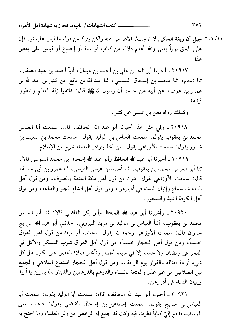 20918 - وَفِي مِثْلِ هَذَا: أَخْبَرَنَا أَبُو عَبْدِ اللهِ الْحَافِظُ , قَالَ: سَمِعْتُ أَبَا الْعَبَّاسِ مُحَمَّدَ بْنَ يَعْقُوبَ يَقُولُ: سَمِعْتُ الْعَبَّاسَ بْنَ الْوَلِيدِ يَقُولُ: سَمِعْتُ مُحَمَّدَ بْنَ شُعَيْبِ بْنِ شَابُورَ يَقُولُ: سَمِعْتُ الْأَوْزَاعِيَّ يَقُولُ: §" مَنْ أَخَذَ بِنَوَادِرِ الْعُلَمَاءِ خَرَجَ مِنَ الْإِسْلَامِ "