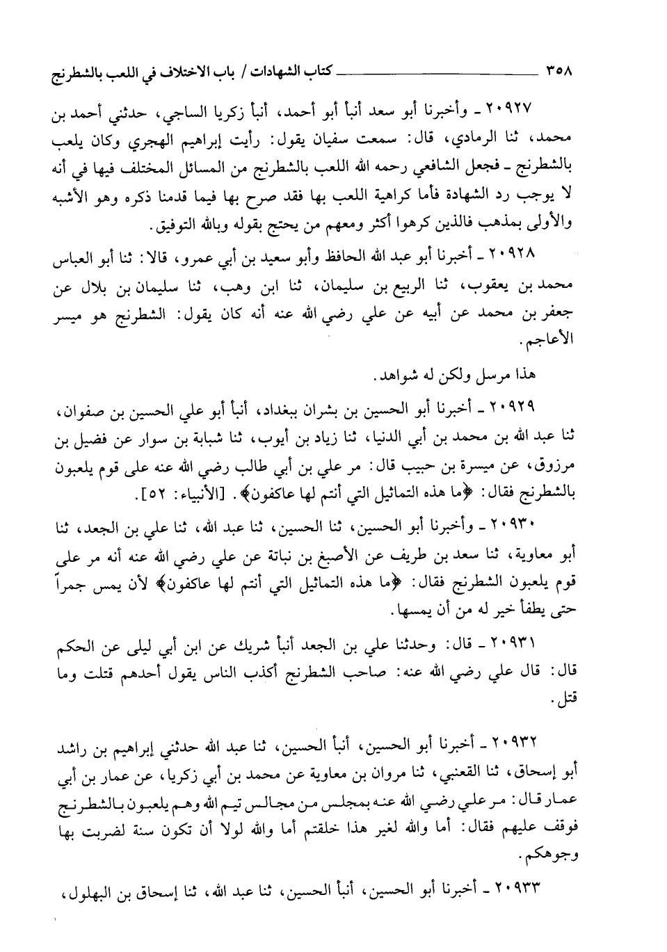 20927 - وَأَخْبَرَنَا أَبُو سَعْدٍ , أنبأ أَبُو أَحْمَدَ , أنبأ زَكَرِيَّا السَّاجِيُّ , حَدَّثَنِي أَحْمَدُ بْنُ مُحَمَّدٍ , ثنا الرَّمَادِيُّ , قَالَ: سَمِعْتُ سُفْيَانَ يَقُولُ: §" رَأَيْتُ إِبْرَاهِيمَ الْهَجَرِيَّ وَكَانَ يَلْعَبُ بِالشِّطْرَنْجِ ". فَجَعَلَ الشَّافِعِيُّ رَحِمَهُ اللهُ اللَّعِبَ بِالشِّطْرَنْجِ مِنَ الْمَسَائِلِ الْمُخْتَلَفِ فِيهَا , فِي أَنَّهُ لَا يُوجِبُ رَدَّ الشَّهَادَةِ , فَأَمَّا كَرَاهِيَةُ اللَّعِبِ بِهَا فَقَدْ صَرَّحَ بِهَا فِيمَا قَدَّمْنَا ذِكْرَهُ , وَهُوَ الْأَشْبَهُ وَالْأُولَى بِمَذْهَبِهِ , فَالَّذِينَ كَرِهُوا أَكْثَرُ , وَمَعَهُمْ مَنْ يُحْتَجُّ بِقَوْلِهِ , وَبِاللهِ التَّوْفِيقُ