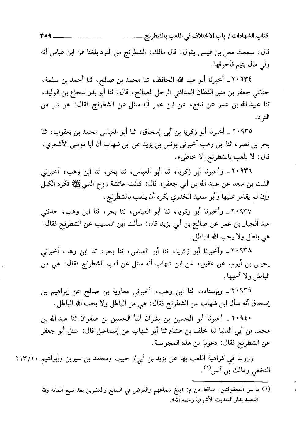20938 - وَأَخْبَرَنَا أَبُو زَكَرِيَّا , ثنا أَبُو الْعَبَّاسِ , ثنا بَحْرٌ , ثنا ابْنُ وَهْبٍ , أَخْبَرَنِي يَحْيَى بْنُ أَيُّوبَ , عَنْ عُقَيْلٍ , عَنِ ابْنِ شِهَابٍ , أَنَّهُ §سُئِلَ عَنْ لَعِبِ الشِّطْرَنْجِ , فَقَالَ: " هِيَ مِنَ الْبَاطِلِ , وَلَا أُحِبُّهَا "