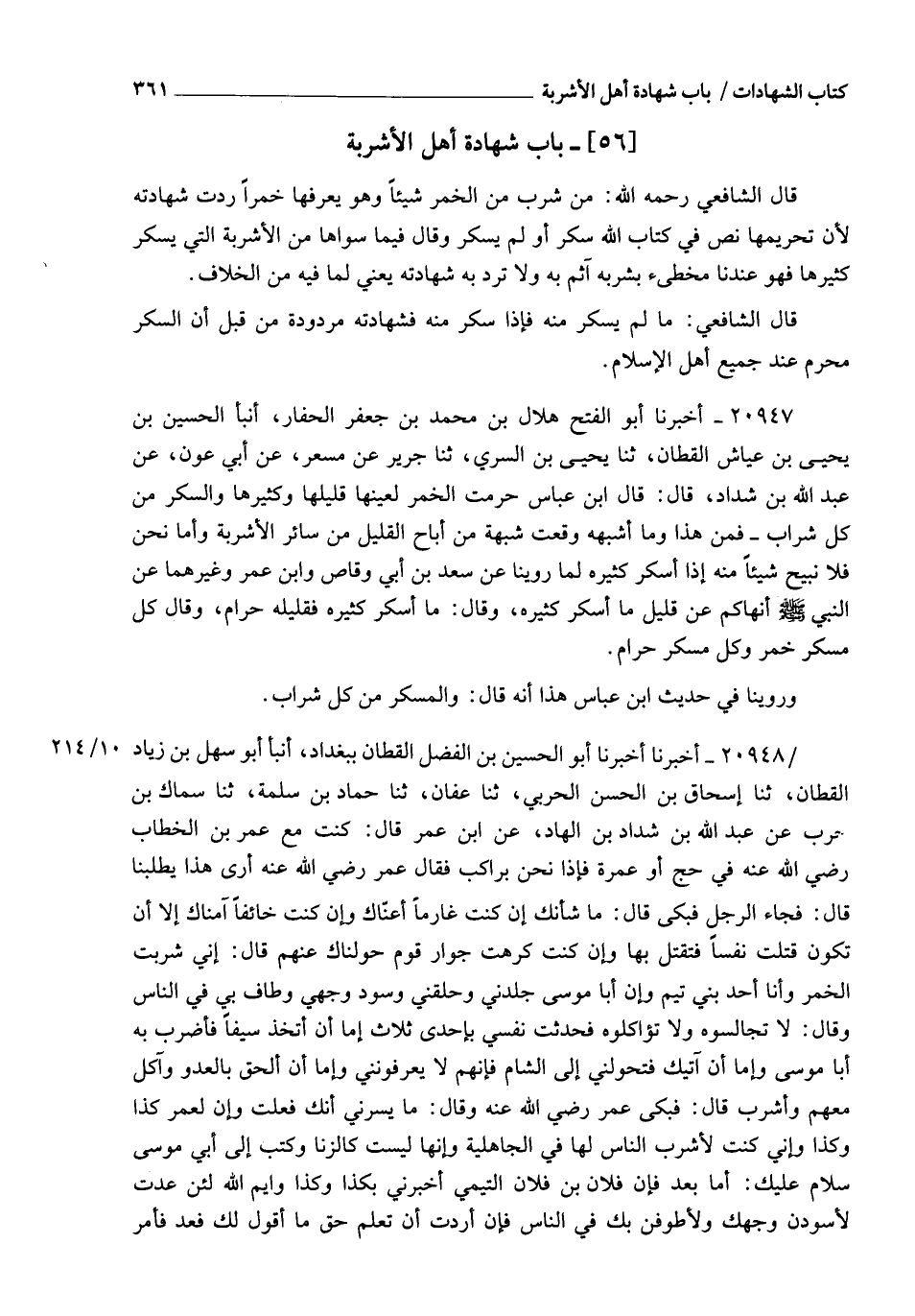 20948 - أَخْبَرَنَا أَبُو الْحُسَيْنِ بْنُ الْفَضْلِ الْقَطَّانُ , بِبَغْدَادَ , أنبأ أَبُو سَهْلِ بْنُ زِيَادٍ الْقَطَّانُ , ثنا إِسْحَاقُ بْنُ الْحَسَنِ الْحَرْبِيُّ , ثنا عَفَّانُ , ثنا حَمَّادُ بْنُ سَلَمَةَ , ثنا سِمَاكُ بْنُ حَرْبٍ , عَنْ عَبْدِ اللهِ بْنِ شَدَّادِ بْنِ الْهَادِ , عَنِ ابْنِ عُمَرَ , قَالَ: كُنْتُ مَعَ عُمَرَ بْنِ الْخَطَّابِ رَضِيَ اللهُ عَنْهُ فِي حَجٍّ , أَوْ عُمْرَةٍ , فَإِذَا نَحْنُ بِرَاكِبٍ , فَقَالَ عُمَرُ رَضِيَ اللهُ عَنْهُ: " أَرَى هَذَا يَطْلُبُنَا " , قَالَ: فَجَاءَ الرَّجُلُ فَبَكَى , قَالَ: " مَا شَأْنُكَ , إِنْ كُنْتَ غَارِمًا أَعَنَّاكَ , وَإِنْ كُنْتَ خَائِفًا أَمَّنَّاكَ إِلَّا أَنْ تَكُونَ قَتَلْتَ نَفْسًا فَتُقْتَلَ بِهَا , وَإِنْ كُنْتَ كَرِهْتَ جِوَارَ قَوْمٍ حَوَّلْنَاكَ عَنْهُمْ " , قَالَ: إِنِّي §شَرِبْتُ الْخَمْرَ , وَأَنَا أَحَدُ بَنِي تَيْمٍ , وَإِنَّ أَبَا مُوسَى جَلَدَنِي , وَحَلَقَنِي , وَسَوَّدَ وَجْهِي , وَطَافَ بِي فِي النَّاسِ , وَقَالَ: لَا تُجَالِسُوهُ , وَلَا تُؤَاكِلُوهُ , فَحَدَّثْتُ نَفْسِي بِإِحْدَى ثَلَاثٍ: إِمَّا أَنْ أَتَّخِذَ سَيْفًا فَأَضْرِبَ بِهِ أَبَا مُوسَى , وَإِمَّا أَنْ آتِيَكَ فَتُحَوِّلَنِي إِلَى الشَّامِ فَإِنَّهُمْ لَا يَعْرِفُونَنِي , وَإِمَّا أنْ أَلْحَقَ بِالْعَدُوِّ , وَآكُلَ مَعَهُمْ وَأَشْرَبَ , قَالَ: فَبَكَى عُمَرُ رَضِيَ اللهُ عَنْهُ وَقَالَ: " مَا يَسُرُّنِي أَنَّكَ فَعَلْتَ وَأَنَّ لِعُمَرَ كَذَا وَكَذَا , وَإِنِّي كُنْتُ لَأَشْرَبَ النَّاسِ لَهَا فِي الْجَاهِلِيَّةِ , وَإِنَّهَا لَيْسَتْ كَالزِّنَا " , وَكَتَبَ إِلَى أَبِي مُوسَى: سَلَامٌ عَلَيْكَ , أَمَّا بَعْدُ , فَإِنَّ فُلَانَ بْنَ فُلَانٍ التَّيْمِيَّ أَخْبَرَنِي بِكَذَا وَكَذَا , وَايْمُ اللهِ لَئِنْ عُدْتَ لَأُسَوِّدَنَّ وَجْهَكَ , وَلَأُطَوِّفَنَّ بِكَ فِي النَّاسِ , فَإِنْ أَرَدْتَ أَنْ تَعْلَمَ حَقَّ مَا أَقُولُ لَكَ فَعُدْ , فَأْمُرِ -[362]- النَّاسَ أَنْ يُجَالِسُوهُ وَيُؤَاكِلُوهُ , وَإِنْ تَابَ فَاقْبَلُوا شَهَادَتَهُ " , وَحَمَلَهُ وَأَعْطَاهُ مِائَتَيْ دِرْهَمٍ. فَأَخْبَرَ عُمَرُ رَضِيَ اللهُ عَنْهُ أَنَّ شَهَادَتَهُ تَسْقُطُ بِشُرْبِهِ الْخَمْرَ , وَأَنَّهُ إِذَا تَابَ حِينَئِذٍ تُقْبَلُ شَهَادَتُهُ ". قَالَ الشَّافِعِيُّ رَحِمَهُ اللهُ: وَبَائِعُ الْخَمْرِ مَرْدُودُ الشَّهَادَةِ , لِأَنَّهُ لَا خِلَافَ بَيْنَ أَحَدٍ مِنَ الْمُسْلِمِينَ فِي أَنَّ بَيْعَهَا مُحَرَّمٌ " قَالَ الشَّيْخُ: وَقَدْ مَضَتِ الدَّلَالَةُ عَلَى تَحْرِيمِ بَيْعِهَا مَعَ الْإِجْمَاعِ فِي كِتَابِ الْبُيُوعِ "