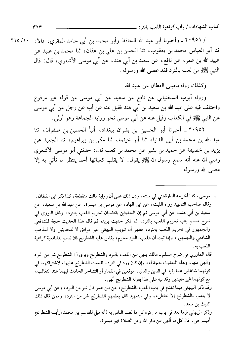 20951 - وَأَخْبَرَنَا أَبُو عَبْدِ اللهِ الْحَافِظُ , وَأَبُو مُحَمَّدِ بْنُ أَبِي حَامِدٍ الْمُقْرِئُ قَالَا: ثنا أَبُو الْعَبَّاسِ مُحَمَّدُ بْنُ يَعْقُوبَ , ثنا الْحَسَنُ بْنُ عَلِيِّ بْنِ عَفَّانَ , ثنا مُحَمَّدُ بْنُ عُبَيْدٍ , عَنْ عُبَيْدِ اللهِ بْنِ عُمَرَ , عَنْ نَافِعٍ , عَنْ سَعِيدِ بْنِ أَبِي هِنْدَ , عَنْ أَبِي مُوسَى الْأَشْعَرِيِّ , قَالَ: قَالَ النَّبِيُّ صَلَّى اللهُ عَلَيْهِ وَسَلَّمَ: §" مَنْ لَعِبَ بِالنَّرْدِ فَقَدْ عَصَى اللهَ وَرَسُولَهُ ". وَكَذَلِكَ رَوَاهُ يَحْيَى الْقَطَّانُ , عَنْ عُبَيْدِ اللهِ وَرَوَاهُ أَيُّوبُ السَّخْتِيَانِيُّ , عَنْ نَافِعٍ , عَنْ سَعِيدٍ , عَنْ أَبِي مُوسَى , مِنْ قَوْلِهِ غَيْرَ مَرْفُوعٍ وَاخْتُلِفَ فِيهِ عَلَى عَبْدِ اللهِ بْنِ سَعِيدِ بْنِ أَبِي هِنْدَ , فَقِيلَ: عَنْهُ , عَنْ أَبِيهِ , عَنْ رَجُلٍ , عَنْ أَبِي مُوسَى , عَنِ النَّبِيِّ صَلَّى اللهُ عَلَيْهِ وَسَلَّمَ فِي الْكِعَابِ , وَقِيلَ: عَنْهُ , عَنْ أَبِي مُوسَى نَحْوَ رِوَايَةِ الْجَمَاعَةِ , وَهُوَ أَوْلَى