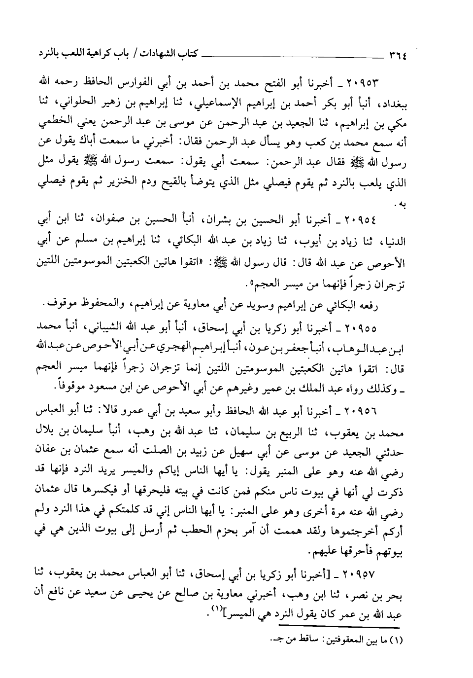 20955 - أَخْبَرَنَا أَبُو زَكَرِيَّا بْنُ أَبِي إِسْحَاقَ , أنبأ أَبُو عَبْدِ اللهِ الشَّيْبَانِيُّ , أنبأ مُحَمَّدُ بْنُ عَبْدِ الْوَهَّابِ , أنبأ جَعْفَرُ بْنُ عَوْنٍ , أنبأ إِبْرَاهِيمُ الْهَجَرِيُّ , عَنْ أَبِي الْأَحْوَصِ , عَنْ عَبْدِ اللهِ , قَالَ: §" اتَّقُوا هَاتَيْنِ الْكَعْبَتَيْنِ الْمَوْسُومَتَيْنِ اللَّتَيْنِ إِنَّمَا تُزْجَرَانِ زَجْرًا , فَإِنَّهُمَا مَيْسِرُ الْعَجَمِ ". وَكَذَلِكَ رَوَاهُ عَبْدُ الْمَلِكِ بْنُ عُمَيْرٍ وَغَيْرُهُمْ , عَنْ أَبِي الْأَحْوَصِ , عَنِ ابْنِ مَسْعُودٍ مَوْقُوفًا