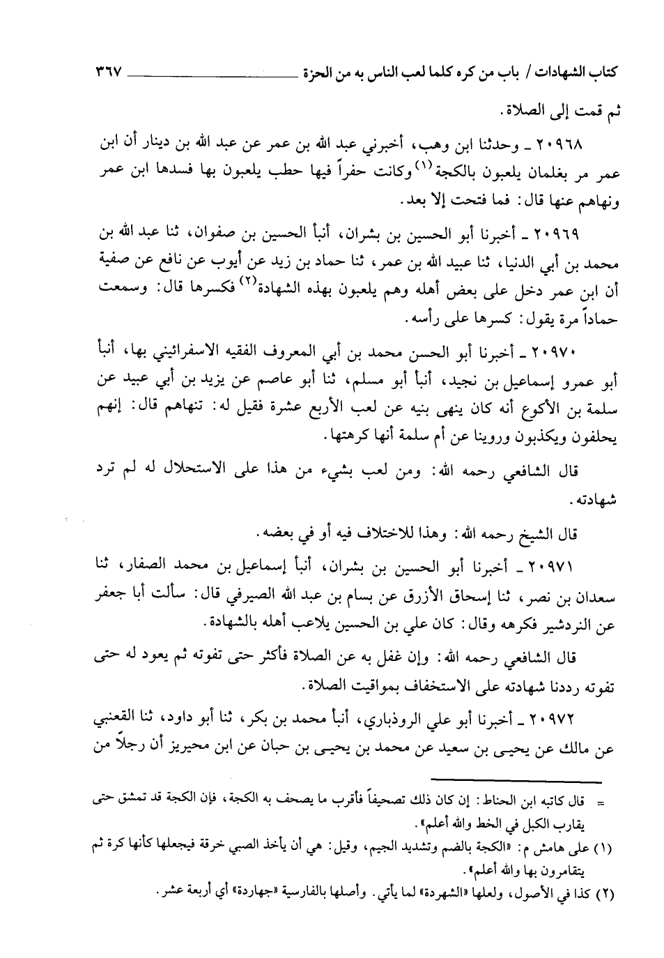 20971 - أَخْبَرَنَا أَبُو الْحُسَيْنِ بْنُ بِشْرَانَ , أنبأ إِسْمَاعِيلُ بْنُ مُحَمَّدٍ الصَّفَّارُ , ثنا سَعْدَانُ بْنُ نَصْرٍ , ثنا إِسْحَاقُ الْأَزْرَقُ , عَنْ بَسَّامِ بْنِ عَبْدِ اللهِ الصَّيْرَفِيِّ , قَالَ: سَأَلْتُ أَبَا جَعْفَرٍ عَنِ النَّرْدَشِيرِ , فَكَرِهَهُ وَقَالَ: §" كَانَ عَلِيُّ بْنُ الْحُسَيْنِ يُلَاعِبُ أَهْلَهُ بِالشَّهْارَدَةِ ". قَالَ الشَّافِعِيُّ رَحِمَهُ اللهُ: " وَإِنْ غَفَلَ بِهِ عَنِ الصَّلَاةِ فَأَكْثَرَ حَتَّى تَفُوتَهُ ثُمَّ يَعُودَ لَهُ حَتَّى تَفُوتَهُ رَدَدْنَا شَهَادَتَهُ عَلَى الِاسْتِخْفَافِ بِمَوَاقِيتِ الصَّلَاةِ "