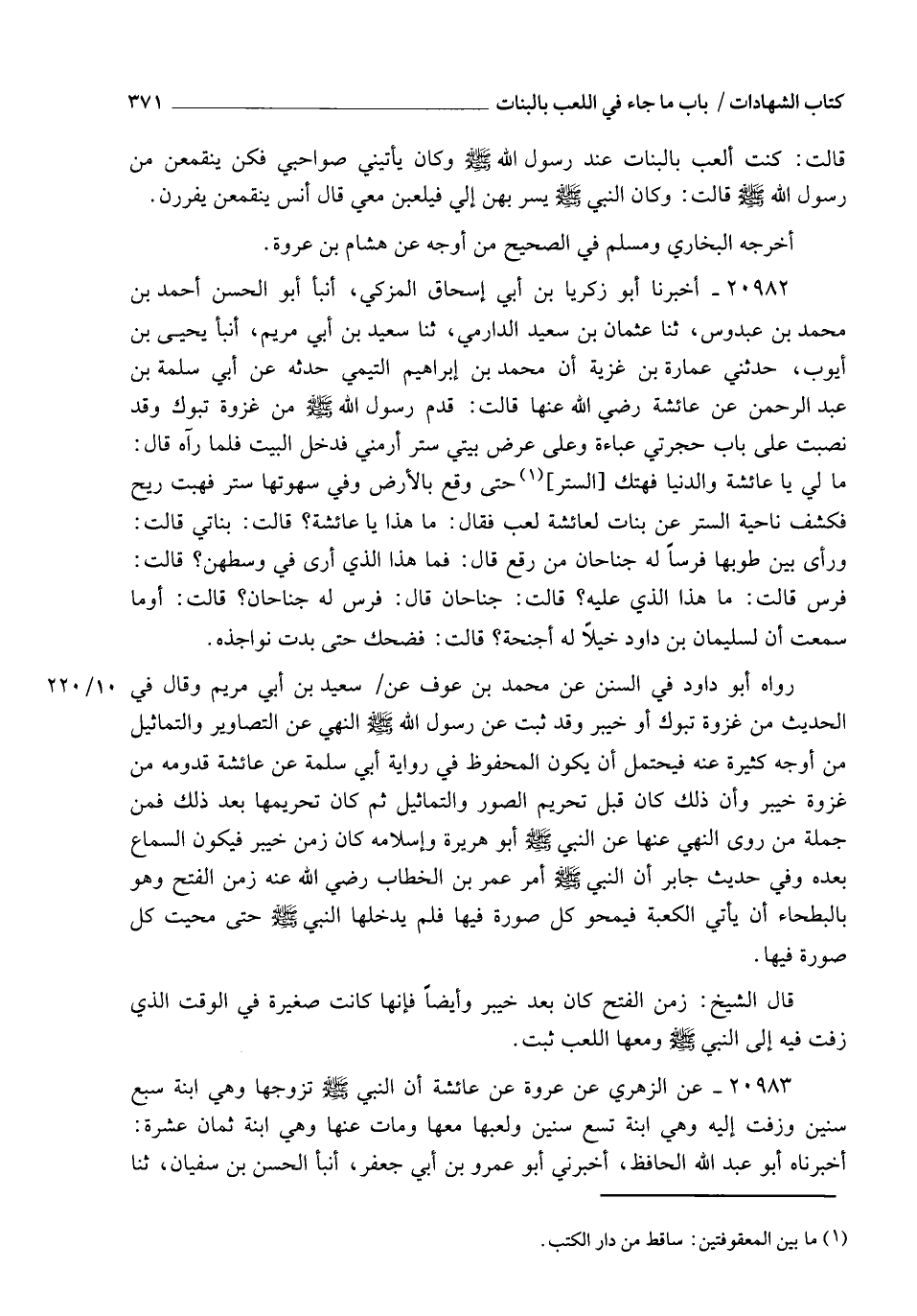 20983 - عَنِ الزُّهْرِيِّ , عَنْ عُرْوَةَ , عَنْ عَائِشَةَ , أَنَّ النَّبِيَّ صَلَّى اللهُ عَلَيْهِ وَسَلَّمَ §تَزَوَّجَهَا وَهِيَ ابْنَةُ سَبْعِ سِنِينَ , وَزُفَّتْ إِلَيْهِ وَهِيَ ابْنَةُ تِسْعِ سِنِينَ وَلُعَبُهَا مَعَهَا , وَمَاتَ عَنْهَا وَهِيَ ابْنَةُ ثَمَانِيَ عَشْرَةَ. أَخْبَرَنَاهُ أَبُو عَبْدِ اللهِ الْحَافِظُ , أَخْبَرَنِي أَبُو عَمْرِو بْنُ أَبِي جَعْفَرٍ , أنبأ الْحَسَنُ بْنُ سُفْيَانَ , ثنا -[372]- فَيَّاضُ بْنُ زُهَيْرٍ , ثنا عَبْدُ الرَّزَّاقِ , أنبأ مَعْمَرٌ , عَنِ الزُّهْرِيِّ فَذَكَرَهُ رَوَاهُ مُسْلِمٌ فِي الصَّحِيحِ , عَنْ عَبْدِ بْنِ حُمَيْدٍ , عَنْ عَبْدِ الرَّزَّاقِ وَلَيْسَ فِي شَيْءٍ مِنَ الرِّوَايَاتِ أَنَّهَا كَانَتْ بَلَغَتْ مَبْلَغَ النِّسَاءِ بِغَيْرِ السِّنِّ فِي وَقْتِ زِفَافِهَا , فَيُحْتَمَلُ إِنْ كَانَ انْشِغَالُهَا بِلُعِبِهَا وَتَقْرِيرُ النَّبِيِّ صَلَّى اللهُ عَلَيْهِ وَسَلَّمَ إِيَّاهَا عَلَى ذَلِكَ إِلَى وَقْتِ بُلُوغِهَا , وَاللهُ أَعْلَمُ , وَعَلَى هَذَا حَمَلَهُ أَبُو عُبَيْدٍ فَقَالَ: " وَلَيْسَ وَجْهُ ذَلِكَ عِنْدَنَا إِلَّا مِنْ أَجْلِ أَنَّهَا لَهْوٌ لِلصِّبْيَانِ , فَلَوْ كَانَ لِلْكِبَارِ لَكَانَ مَكْرُوهًا " وَذَكَرَ الْحَلِيمِيُّ أَنَّهُ: إِنْ عُمِلَ مِنْ خَشَبٍ أَوْ حَجَرٍ أَوْ صُفْرٍ أَوْ نُحَاسٍ شَبَهَ آدَمَيٍّ تَامِّ الْأَطْرَافِ كَالْوَثَنِ وَجَبَ كَسْرُهُ , وَلَمْ يَجُزْ إِطْلَاقُ إِمْسَاكِهِ لَهُنَّ , فَأَمَّا إِذَا كَانَتِ الْوَاحِدَةُ مِنْهُنَّ تَأْخُذُ خِرْقَةً فَتَلُفُّهَا ثُمَّ تُشَكِّلُهَا بِشَكْلٍ مِنْ أَشْكَالِ الصَّبَايَا وَتُسَمِّيهَا بِنْتًا أَوْ أُمَّا , وَتَلْعَبُ بِهَا فَلَا تُمْنَعُ مِنْهَا " , وَذَكَرَ مَا فِي ذَلِكَ مِنَ انْبِسَاطِ قَلْبِهَا وَحُسْنِ نَشْوِهَا , وَمُمَارَسِتِهَا مُعَالَجَةَ الصِّبْيَانِ "