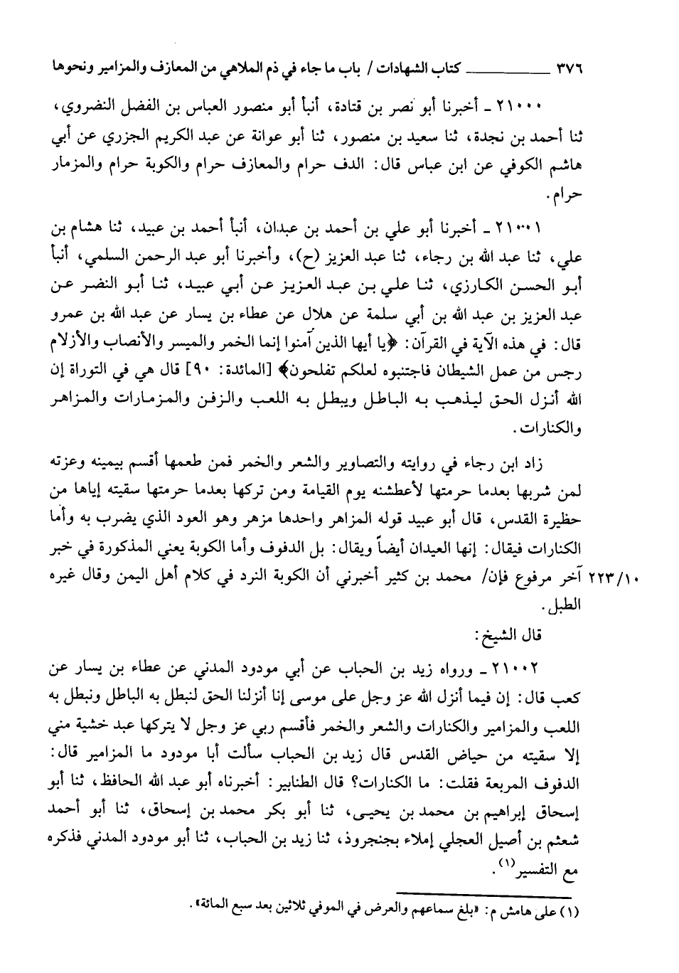 21002 - وَرَوَاهُ زَيْدُ بْنُ الْحُبَابِ , عَنْ أَبِي مَوْدُودٍ الْمَدَنِيِّ , عَنْ عَطَاءِ بْنِ يَسَارٍ , عَنْ كَعْبٍ , قَالَ: " §إِنَّ فِيمَا أَنْزَلَ اللهُ عَزَّ وَجَلَّ عَلَى مُوسَى: إِنَّا أَنْزَلْنَا الْحَقَّ لِنُبْطِلَ بِهِ الْبَاطِلَ , وَنُبْطِلَ بِهِ اللَّعِبَ وَالْمَزَامِيرَ وَالْكِنَّارَاتِ وَالشِّعْرَ وَالْخَمْرَ , فَأَقْسَمَ رَبِّي عَزَّ وَجَلَّ: لَا يَتْرُكُهَا عَبْدٌ خَشْيَةً مِنِّي إِلَّا سَقَيْتُهُ مِنْ حِيَاضِ الْقُدُسِ. قَالَ زَيْدُ بْنُ الْحُبَابِ: سَأَلْتُ أَبَا مَوْدُودٍ: مَا الْمَزَامِيرُ؟ قَالَ: الدُّفُوفُ الْمُرَبَّعَةُ , فَقُلْتُ: مَا الْكِنَّارَاتُ؟ قَالَ: الطَّنَابِيرُ. أَخْبَرَنَاهُ أَبُو عَبْدِ اللهِ الْحَافِظُ , ثنا أَبُو إِسْحَاقَ إِبْرَاهِيمُ بْنُ مُحَمَّدِ بْنِ يَحْيَى , ثنا أَبُو بَكْرٍ مُحَمَّدُ بْنُ إِسْحَاقَ , ثنا أَبُو أَحْمَدَ شَعْثَمُ بْنُ أَصِيلٍ الْعِجْلِيُّ إِمْلَاءً بِجَنْجَرُوذَ , ثنا زَيْدُ بْنُ الْحُبَابِ , ثنا أَبُو مَوْدُودٍ الْمَدَنِيُّ فَذَكَرَهُ مَعَ التَّفْسِيرِ