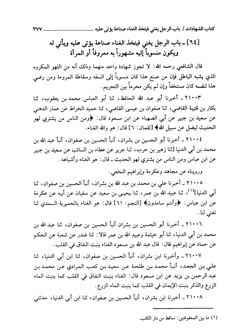 21004 - أَخْبَرَنَا أَبُو الْحُسَيْنِ بْنُ بِشْرَانَ , أنبأ الْحُسَيْنُ بْنُ صَفْوَانَ , أنبأ عَبْدُ اللهِ بْنُ مُحَمَّدِ بْنِ أَبِي الدُّنْيَا , ثنا زُهَيْرُ بْنُ حَرْبٍ , ثنا جَرِيرٌ , عَنْ عَطَاءِ بْنِ السَّائِبِ , عَنْ سَعِيدِ بْنِ جُبَيْرٍ , عَنِ ابْنِ عَبَّاسٍ: {§وَمِنَ النَّاسِ مَنْ يَشْتَرِي لَهْوَ الْحَدِيثِ} [لقمان: 6] قَالَ: " هُوَ الْغِنَاءُ وَأَشْبَاهُهُ ". وَرُوِّينَاهُ , عَنْ مُجَاهِدٍ وَعِكْرِمَةَ , وَإِبْرَاهِيمَ النَّخَعِيِّ