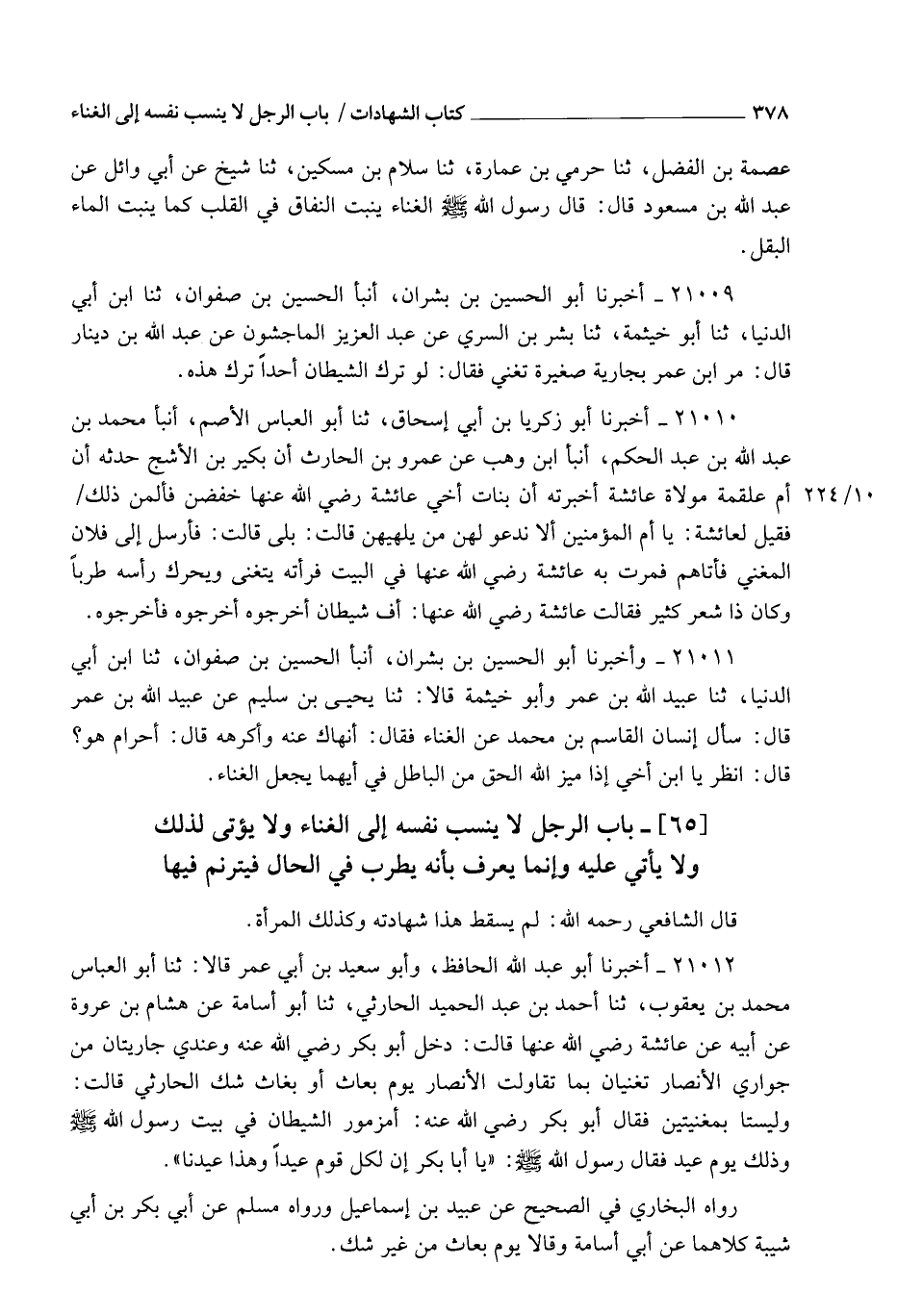 21010 - أَخْبَرَنَا أَبُو زَكَرِيَّا بْنُ أَبِي إِسْحَاقَ , ثنا أَبُو الْعَبَّاسِ الْأَصَمُّ , أنبأ مُحَمَّدُ بْنُ عَبْدِ اللهِ بْنِ عَبْدِ الْحَكَمِ , أنبأ ابْنُ وَهْبٍ , عَنْ عَمْرِو بْنِ الْحَارِثِ , أَنَّ بُكَيْرَ بْنَ الْأَشَجِّ , حَدَّثَهُ أَنَّ أُمَّ عَلْقَمَةَ مَوْلَاةَ عَائِشَةَ أَخْبَرَتْهُ أَنَّ بَنَاتَ أَخِي عَائِشَةَ رَضِيَ اللهُ عَنْهَا خُفِضْنَ فَأَلِمْنَ ذَلِكَ , فَقِيلَ لِعَائِشَةَ: يَا أُمَّ الْمُؤْمِنِينَ , أَلَا نَدْعُو لَهُنَّ مِنْ يُلَهِّيهِنَّ؟ قَالَتْ: " بَلَى , قَالَتْ: فَأُرْسِلَ إِلَى فُلَانٍ الْمُغَنِّي فَأَتَاهُمْ , فَمَرَّتْ بِهِ عَائِشَةُ رَضِيَ اللهُ عَنْهَا فِي الْبَيْتِ , فَرَأَتْهُ يَتَغَنَّى , وَيُحَرِّكُ رَأْسَهُ طَرَبًا , وَكَانَ ذَا شَعْرٍ كَثِيرٍ , فَقَالَتْ عَائِشَةُ رَضِيَ اللهُ عَنْهَا: §" أُفٍّ , شَيْطَانٌ أَخْرِجُوهُ , أَخْرِجُوهُ " , فَأَخْرَجُوهُ