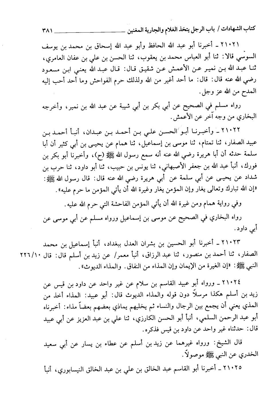 21021 - أَخْبَرَنَا أَبُو عَبْدِ اللهِ الْحَافِظُ , وَأَبُو عَبْدِ اللهِ إِسْحَاقُ بْنُ مُحَمَّدِ بْنِ يُوسُفَ السُّوسِيُّ قَالَا: ثنا أَبُو الْعَبَّاسِ مُحَمَّدُ بْنُ يَعْقُوبَ , ثنا الْحَسَنُ بْنُ عَلِيِّ بْنِ عَفَّانَ الْعَامِرِيُّ , ثنا عَبْدُ اللهِ بْنُ نُمَيْرٍ , عَنِ الْأَعْمَشِ , عَنْ شَقِيقٍ , قَالَ: قَالَ عَبْدُ اللهِ يَعْنِي ابْنَ مَسْعُودٍ رَضِيَ اللهُ عَنْهُ، قَالَ رَسُولُ اللهِ صَلَّى اللهُ عَلَيْهِ وَسَلَّمَ: §" مَا أَحَدٌ أَغْيَرَ مِنَ اللهِ , وَلِذَلِكَ حَرَّمَ الْفَوَاحِشَ , وَمَا أَحَدٌ أَحَبَّ إِلَيْهِ الْمَدْحُ مِنَ اللهِ عَزَّ وَجَلَّ ". رَوَاهُ مُسْلِمٌ فِي الصَّحِيحِ , عَنْ أَبِي بَكْرِ بْنِ أَبِي شَيْبَةَ , عَنْ عَبْدِ اللهِ بْنِ نُمَيْرٍ , وَأَخْرَجَهُ الْبُخَارِيُّ مِنْ وَجْهٍ آخَرَ , عَنِ الْأَعْمَشِ