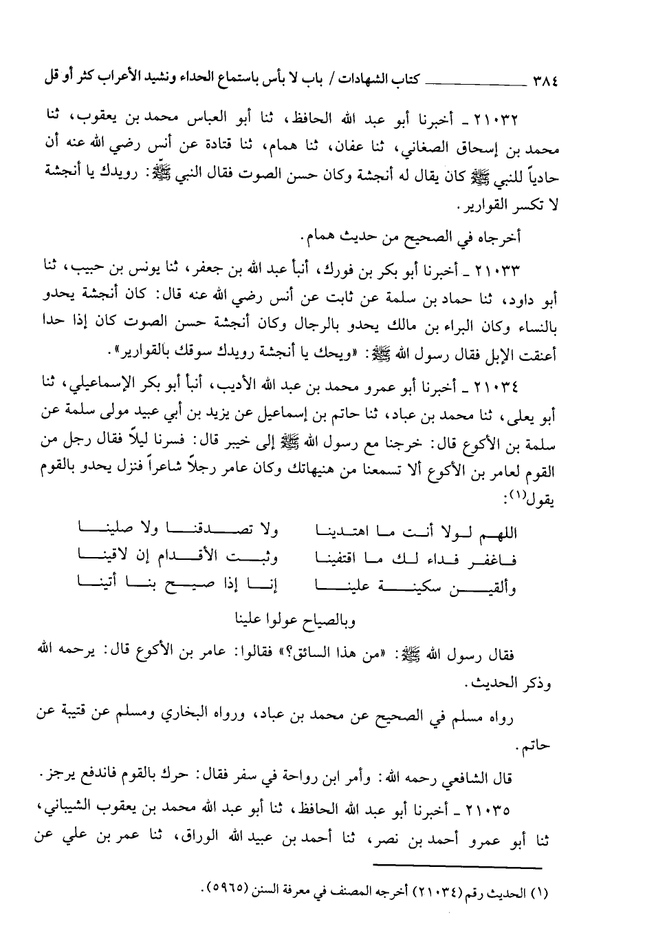 21032 - أَخْبَرَنَا أَبُو عَبْدِ اللهِ الْحَافِظُ , ثنا أَبُو الْعَبَّاسِ مُحَمَّدُ بْنُ يَعْقُوبَ , ثنا مُحَمَّدُ بْنُ إِسْحَاقَ الصَّغَانِيُّ , ثنا عَفَّانُ , ثنا هَمَّامٌ , ثنا قَتَادَةُ , عَنْ أَنَسٍ , رَضِيَ اللهُ عَنْهُ أَنَّ حَادِيًا , لِلنَّبِيِّ صَلَّى اللهُ عَلَيْهِ وَسَلَّمَ كَانَ يُقَالُ لَهُ أَنْجَشَةُ , وَكَانَ حَسَنَ الصَّوْتِ , فَقَالَ النَّبِيُّ صَلَّى اللهُ عَلَيْهِ وَسَلَّمَ: §" رُوَيْدَكَ يَا أَنْجَشَةُ , لَا تَكْسِرِ الْقَوَارِيرَ " أَخْرَجَاهُ فِي الصَّحِيحِ مِنْ حَدِيثِ هَمَّامٍ