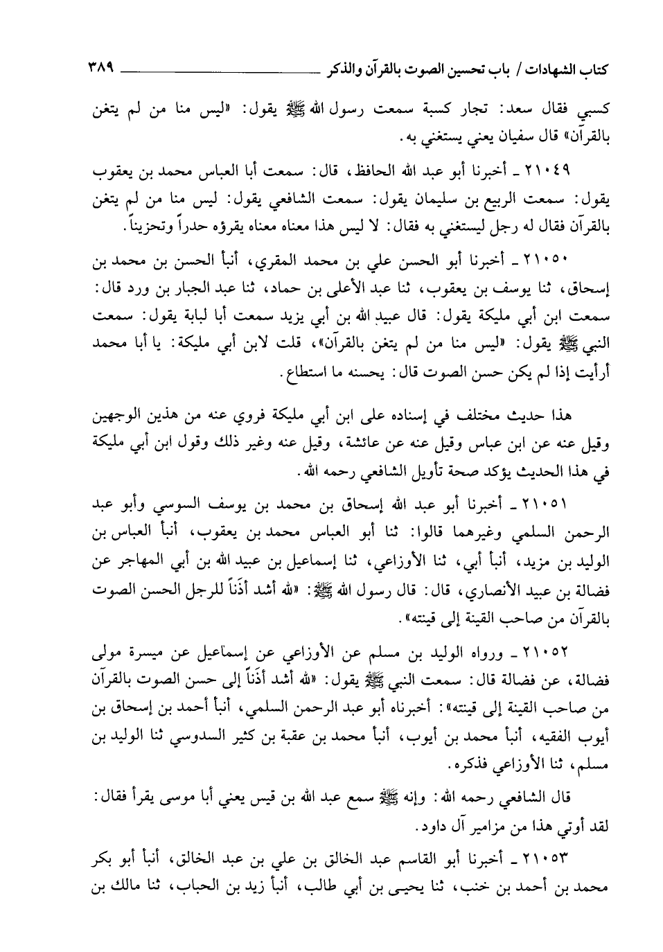 21049 - أَخْبَرَنَا أَبُو عَبْدِ اللهِ الْحَافِظُ قَالَ: سَمِعْتُ أَبَا الْعَبَّاسِ مُحَمَّدَ بْنَ يَعْقُوبَ يَقُولُ: سَمِعْتُ الرَّبِيعَ بْنَ سُلَيْمَانَ يَقُولُ: سَمِعْتُ الشَّافِعِيَّ يَقُولُ: §" لَيْسَ مِنَّا مَنْ لَمْ يَتَغَنَّ بِالْقُرْآنِ " , فَقَالَ لَهُ رَجُلٌ: لِيَسْتَغْنِيَ بِهِ؟ فَقَالَ: " لَا , لَيْسَ هَذَا مَعْنَاهُ , مَعْنَاهُ: يَقْرَؤُهُ حَدْرًا وَتَحْزِينًا "