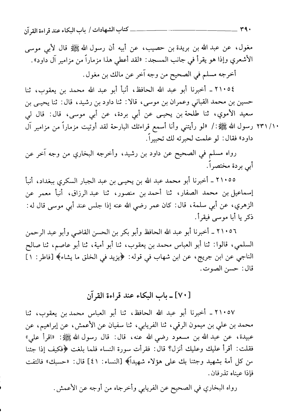 21057 - أَخْبَرَنَا أَبُو عَبْدِ اللهِ الْحَافِظُ , ثنا أَبُو الْعَبَّاسِ مُحَمَّدُ بْنُ يَعْقُوبَ , ثنا مُحَمَّدُ بْنُ عَلِيِّ بْنِ مَيْمُونٍ الرَّقِّيُّ , ثنا الْفِرْيَابِيُّ , ثنا سُفْيَانُ , عَنِ الْأَعْمَشِ , عَنْ إِبْرَاهِيمَ , عَنْ عَبِيْدَةَ , عَنْ عَبْدِ اللهِ بْنِ مَسْعُودٍ , رَضِيَ اللهُ عَنْهُ , قَالَ: قَالَ رَسُولُ اللهِ صَلَّى اللهُ عَلَيْهِ وَسَلَّمَ: " §اقْرَأْ عَلَيَّ " , فَقُلْتُ: أَقْرَأُ عَلَيْكَ , وَعَلَيْكَ أُنْزِلَ؟ قَالَ: فَقَرَأْتُ سُورَةَ النِّسَاءِ , فَلَمَّا بَلَغْتُ: {فَكَيْفَ إِذَا جِئْنَا مِنْ كُلِّ أُمَّةٍ بِشَهِيدٍ وَجِئْنَا بِكَ عَلَى هَؤُلَاءِ شَهِيدًا} [النساء: 41] قَالَ: " حَسْبُكَ " , فَالْتَفَتُّ , فَإِذَا عَيْنَاهُ تَذْرِفَانِ. رَوَاهُ الْبُخَارِيُّ فِي الصَّحِيحِ , عَنِ الْفِرْيَابِيِّ , وَأَخْرَجَاهُ مِنْ أَوْجُهٍ , عَنِ الْأَعْمَشِ