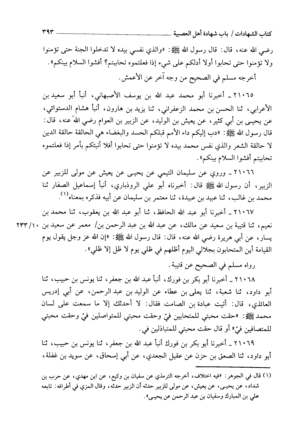 21065 - أَخْبَرَنَا أَبُو مُحَمَّدٍ عَبْدُ اللهِ بْنُ يُوسُفَ الْأَصْبَهَانِيُّ , أنبأ أَبُو سَعِيدِ بْنُ الْأَعْرَابِيِّ , ثنا الْحَسَنُ بْنُ مُحَمَّدٍ الزَّعْفَرَانِيُّ , ثنا يَزِيدُ بْنُ هَارُونَ , أنبأ هِشَامٌ الدَّسْتُوَائِيُّ , عَنْ يَحْيَى بْنِ أَبِي كَثِيرٍ , عَنْ يَعِيشَ بْنِ الْوَلِيدِ , عَنِ الزُّبَيْرِ بْنِ الْعَوَّامِ رَضِيَ اللهُ عَنْهُ , قَالَ: قَالَ رَسُولُ اللهِ صَلَّى اللهُ عَلَيْهِ وَسَلَّمَ: " §دَبَّ إِلَيْكُمْ دَاءُ الْأُمَمِ قَبْلَكُمْ: الْحَسَدُ وَالْبَغْضَاءُ , هِيَ الْحَالِقَةُ , حَالِقَةُ الدِّينِ لَا حَالِقَةُ الشَّعْرِ , وَالَّذِي نَفْسُ مُحَمَّدٍ بِيَدِهِ , لَا تُؤْمِنُوا حَتَّى تَحَابُّوا , أَفَلَا أُنَبِّئُكُمْ بِأَمْرٍ إِذَا فَعَلْتُمُوهُ تَحَابَبْتُمْ؟ أَفْشُوا السَّلَامَ بَيْنَكُمْ ".