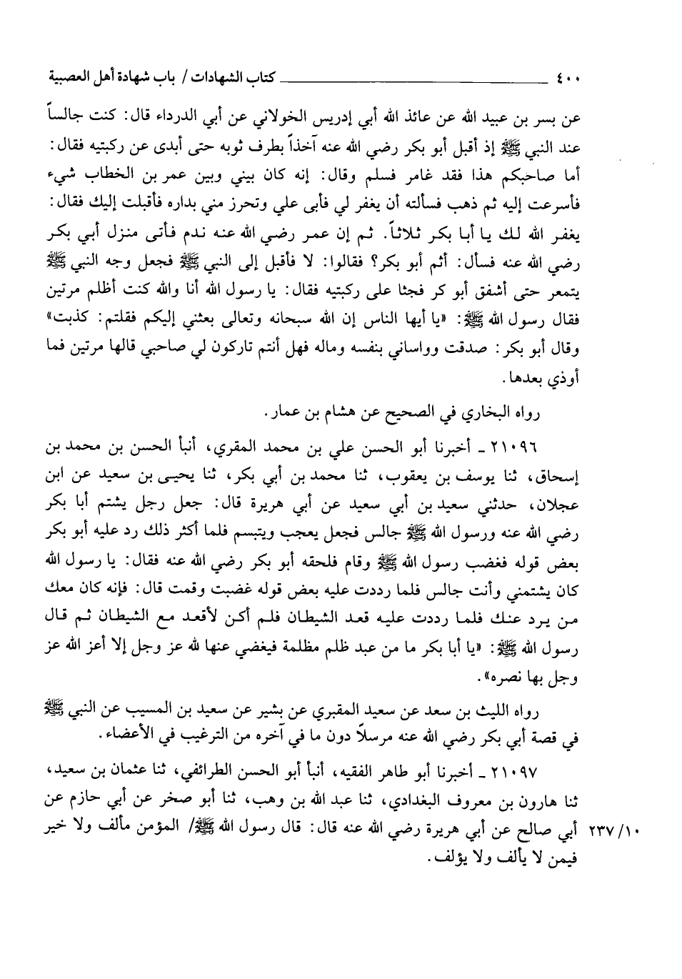 21096 - أَخْبَرَنَا أَبُو الْحَسَنِ عَلِيُّ بْنُ مُحَمَّدٍ الْمُقْرِئُ , أنبأ الْحَسَنُ بْنُ مُحَمَّدِ بْنِ إِسْحَاقَ , ثنا يُوسُفُ بْنُ يَعْقُوبَ , ثنا مُحَمَّدُ بْنُ أَبِي بَكْرٍ , ثنا يَحْيَى بْنُ سَعِيدٍ , عَنِ ابْنِ عَجْلَانَ , حَدَّثَنِي سَعِيدُ بْنُ أَبِي سَعِيدٍ , عَنْ أَبِي هُرَيْرَةَ , قَالَ: جَعَلَ رَجُلٌ يَشْتِمُ أَبَا بَكْرٍ رَضِيَ اللهُ عَنْهُ , وَرَسُولُ اللهِ صَلَّى اللهُ عَلَيْهِ وَسَلَّمَ جَالِسٌ , فَجَعَلَ يَعْجَبُ وَيَتَبَسَّمُ , فَلَمَّا أَكْثَرَ ذَلِكَ رَدَّ عَلَيْهِ أَبُو بَكْرٍ بَعْضَ قَوْلِهِ , فَغَضِبَ رَسُولُ اللهِ صَلَّى اللهُ عَلَيْهِ وَسَلَّمَ وَقَامَ , فَلَحِقَهُ أَبُو بَكْرٍ رَضِيَ اللهُ عَنْهُ , فَقَالَ: يَا رَسُولَ اللهِ , كَانَ يَشْتُمُنِي وَأَنْتَ جَالِسٌ , فَلَمَّا رَدَدْتُ عَلَيْهِ بَعْضَ قَوْلِهِ غَضِبْتَ وَقُمْتَ قَالَ: " فَإِنَّهُ §كَانَ مَعَكَ مَنْ يَرُدُّ عَنْكَ , فَلَمَّا رَدَدْتَ عَلَيْهِ قَعَدَ الشَّيْطَانُ , فَلَمْ أَكُنْ لِأَقْعُدَ مَعَ الشَّيْطَانِ " , ثُمَّ قَالَ رَسُولُ اللهِ صَلَّى اللهُ عَلَيْهِ وَسَلَّمَ: " يَا أَبَا بَكْرٍ مَا مِنْ عَبْدٍ ظُلِمَ مَظْلِمَةً فَيُغْضِي عَنْهَا لِلَّهِ عَزَّ وَجَلَّ , إِلَّا أَعَزَّ اللهُ عَزَّ وَجَلَّ بِهَا نَصْرَهُ ". رَوَاهُ اللَّيْثُ بْنُ سَعْدٍ , عَنْ سَعِيدٍ الْمَقْبُرِيِّ , عَنْ بَشِيرٍ , عَنْ سَعِيدِ بْنِ الْمُسَيِّبِ , عَنِ النَّبِيِّ صَلَّى اللهُ عَلَيْهِ وَسَلَّمَ فِي قِصَّةِ أَبِي بَكْرٍ رَضِيَ اللهُ عَنْهُ مُرْسَلًا دُونَ مَا فِي آخِرِهِ مِنَ التَّرْغِيبِ فِي الْإِغْضَاءِ