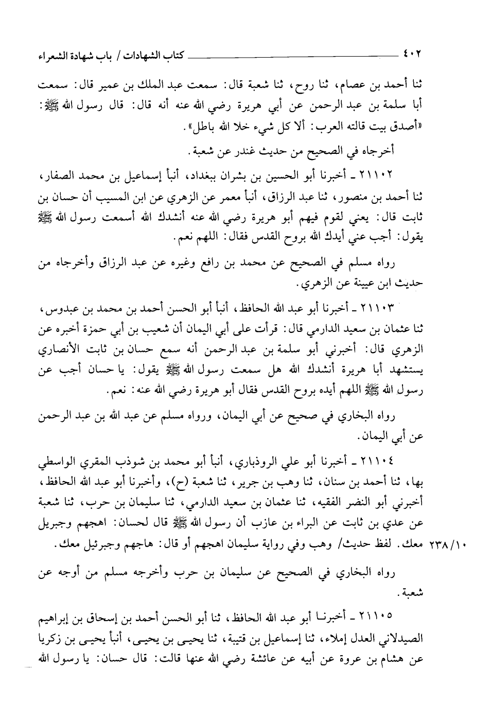 21104 - أَخْبَرَنَا أَبُو عَلِيٍّ الرُّوذْبَارِيُّ , أنبأ أَبُو مُحَمَّدِ بْنُ شَوْذَبٍ الْمُقْرِئُ الْوَاسِطِيُّ , بِهَا , ثنا أَحْمَدُ بْنُ سِنَانٍ , ثنا وَهْبُ بْنُ جَرِيرٍ , ثنا شُعْبَةُ ح وَأَخْبَرَنَا أَبُو عَبْدِ اللهِ الْحَافِظُ , أَخْبَرَنِي أَبُو النَّضْرِ الْفَقِيهُ , ثنا عُثْمَانُ بْنُ سَعِيدٍ الدَّارِمِيُّ , ثنا سُلَيْمَانُ بْنُ حَرْبٍ , ثنا شُعْبَةُ , عَنْ عَدِيِّ بْنِ ثَابِتٍ , عَنِ الْبَرَاءِ بْنِ عَازِبٍ , أَنَّ رَسُولَ اللهِ صَلَّى اللهُ عَلَيْهِ وَسَلَّمَ قَالَ لِحَسَّانَ: §" اهْجُهُمْ وَجِبْرِيلُ مَعَكَ ". لَفْظُ حَدِيثِ وَهْبٍ , وَفِي رِوَايَةِ سُلَيْمَانَ: " اهْجُهُمْ " , أَوْ قَالَ: " هَاجِهِمْ وَجِبْرَئِيلُ مَعَكَ " رَوَاهُ الْبُخَارِيُّ فِي الصَّحِيحِ عَنْ سُلَيْمَانَ بْنِ حَرْبٍ , وَأَخْرَجَهُ مُسْلِمٌ مِنْ أَوْجُهٍ , عَنْ شُعْبَةَ