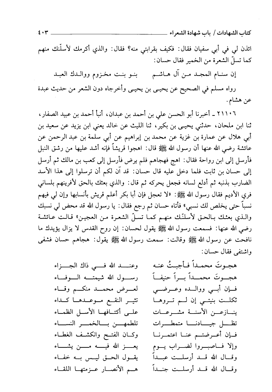 21106 - أَخْبَرَنَا أَبُو الْحَسَنِ عَلِيُّ بْنُ أَحْمَدَ بْنِ عَبْدَانَ , أنبأ أَحْمَدُ بْنُ عُبَيْدٍ الصَّفَّارُ , ثنا ابْنُ مِلْحَانَ , حَدَّثَنِي يَحْيَى بْنُ بُكَيْرٍ , ثنا اللَّيْثُ , عَنْ خَالِدٍ يَعْنِي ابْنَ يَزِيدَ , عَنْ سَعِيدِ بْنِ أَبِي هِلَالٍ , عَنْ عُمَارَةَ بْنِ غَزِيَّةَ , عَنْ مُحَمَّدِ بْنِ إِبْرَاهِيمَ , عَنْ أَبِي سَلَمَةَ بْنِ عَبْدِ الرَّحْمَنِ , عَنْ عَائِشَةَ رَضِيَ اللهُ عَنْهَا , أَنَّ رَسُولَ اللهِ صَلَّى اللهُ عَلَيْهِ وَسَلَّمَ قَالَ: " §اهْجُوا قُرَيْشًا , فَإِنَّهُ أَشَدُّ عَلَيْهَا مِنْ رَشْقِ النَّبْلِ" , فَأَرْسَلَ إِلَى ابْنِ رَوَاحَةَ فَقَالَ: " اهْجُ" , فَهَجَاهُمْ فَلَمْ يَرْضَ , فَأَرْسَلَ إِلَى كَعْبِ بْنِ مَالِكٍ , ثُمَّ أَرْسَلَ إِلَى حَسَّانَ بْنِ ثَابِتٍ , فَلَمَّا دَخَلَ عَلَيْهِ قَالَ حَسَّانُ: قَدْ آنَ لَكُمْ أَنْ تُرْسِلُوا إِلَى هَذَا الْأَسَدِ الضَّارِبِ بِذَنَبِهِ ثُمَّ أَدْلَعَ لِسَانَهُ , فَجَعَلَ يُحَرِّكُهُ , ثُمَّ قَالَ: وَالَّذِي بَعَثَكَ بِالْحَقِّ لَأَفْرِيَنَّهُمْ بِلِسَانِي فَرْيَ الْأَدِيمِ , فَقَالَ رَسُولُ اللهِ صَلَّى اللهُ عَلَيْهِ وَسَلَّمَ: " لَا تَعْجَلْ , فَإِنَّ أَبَا بَكْرٍ أَعْلَمُ قُرَيْشٍ بِأَنْسَابِهَا , وَإِنَّ لِي فِيهِمْ نَسَبًا حَتَّى يُخَلِّصَ لَكَ نَسَبِي" , فَأَتَاهُ حَسَّانُ ثُمَّ رَجَعَ فَقَالَ: يَا رَسُولَ اللهِ , قَدْ مَحَضَ لِي نَسَبَكَ , وَالَّذِي بَعَثَكَ بِالْحَقِّ لَأَسُلَّنَّكَ مِنْهُمْ كَمَا تُسَلُّ الشَّعْرَةُ مِنَ الْعَجِينِ , قَالَتْ عَائِشَةُ رَضِيَ اللهُ عَنْهَا: فَسَمِعْتُ رَسُولَ اللهِ صَلَّى اللهُ عَلَيْهِ وَسَلَّمَ يَقُولُ لِحَسَّانَ: " إِنَّ رُوحَ الْقُدُسِ لَا يَزَالُ يُؤَيِّدُكَ مَا نَافَحْتَ عَنْ رَسُولِ اللهِ صَلَّى اللهُ عَلَيْهِ وَسَلَّمَ" , وَقَالَتْ: سَمِعْتُ رَسُولَ اللهِ صَلَّى اللهُ عَلَيْهِ وَسَلَّمَ يَقُولُ: " هَجَاهُمْ حَسَّانُ فَشَفَى وَاشْتَفَى" , فَقَالَ حَسَّانُ: