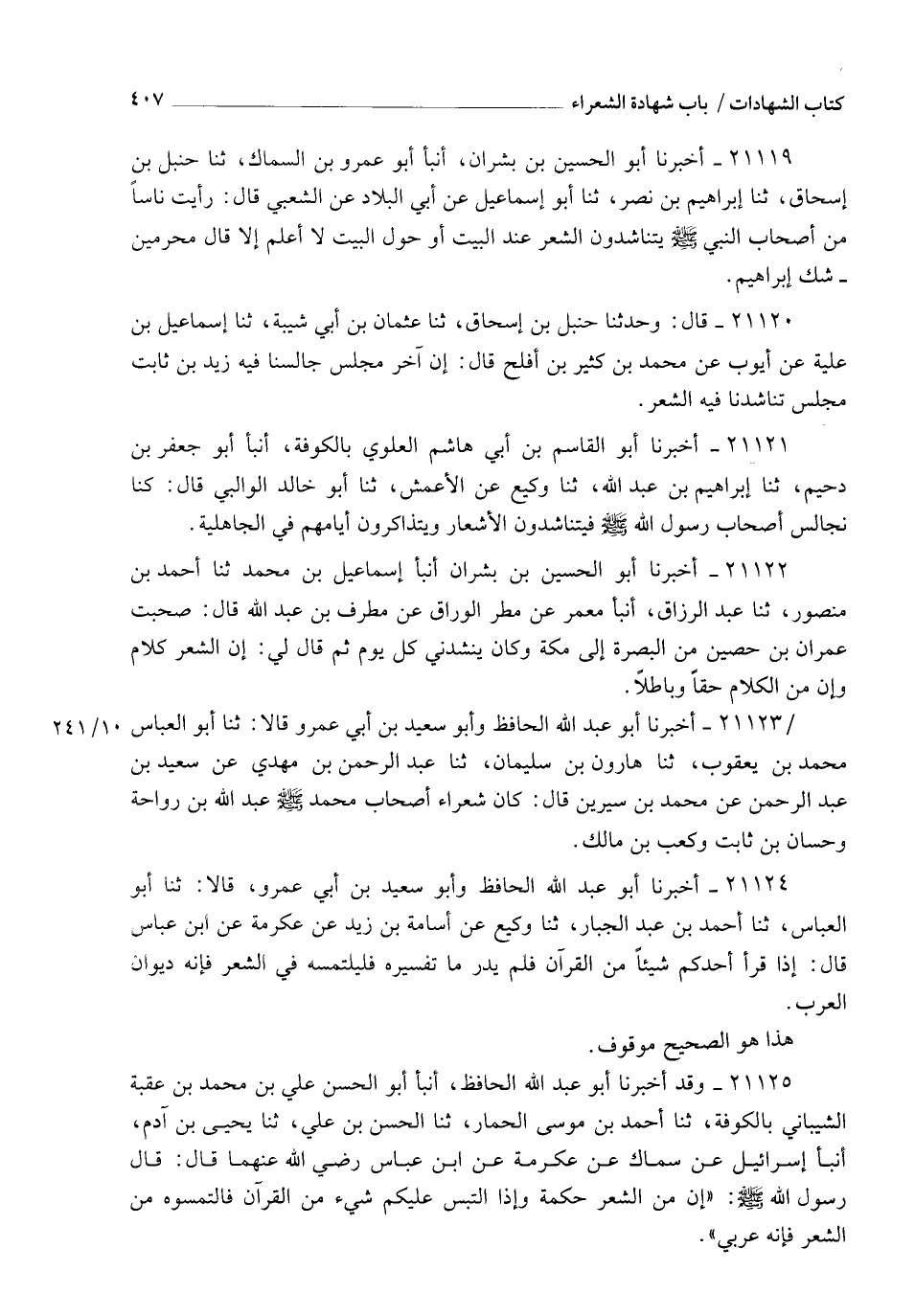 21119 - أَخْبَرَنَا أَبُو الْحُسَيْنِ بْنُ بِشْرَانَ , أنبأ أَبُو عَمْرِو بْنُ السَّمَّاكِ , ثنا حَنْبَلُ بْنُ إِسْحَاقَ , ثنا إِبْرَاهِيمُ بْنُ نَصْرٍ , ثنا أَبُو إِسْمَاعِيلَ , عَنْ أَبِي الْبِلَادِ , عَنِ الشَّعْبِيِّ , قَالَ: §" رَأَيْتُ نَاسًا مِنْ أَصْحَابِ النَّبِيِّ صَلَّى اللهُ عَلَيْهِ وَسَلَّمَ يَتَنَاشَدُونَ الشِّعْرَ عِنْدَ الْبَيْتِ , أَوْ حَوْلَ الْبَيْتِ , لَا أَعْلَمُ إِلَّا قَالَ: مُحْرِمِينَ " شَكَّ إِبْرَاهِيمُ