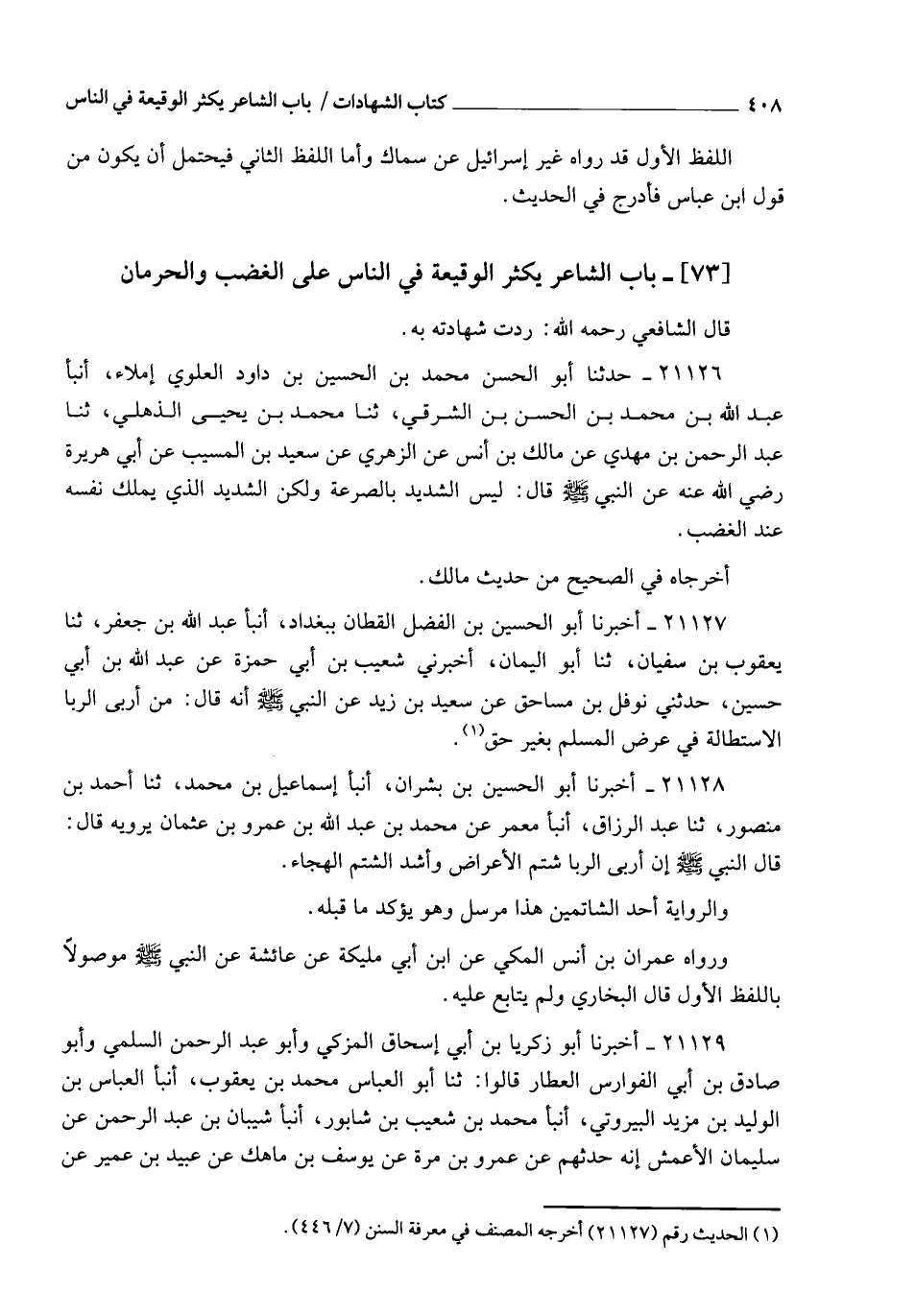 21127 - أَخْبَرَنَا أَبُو الْحُسَيْنِ بْنُ الْفَضْلِ الْقَطَّانُ , بِبَغْدَادَ , أنبأ عَبْدُ اللهِ بْنُ جَعْفَرٍ , ثنا يَعْقُوبُ بْنُ سُفْيَانَ , ثنا أَبُو الْيَمَانِ , أَخْبَرَنِي شُعَيْبُ بْنُ أَبِي حَمْزَةَ , عَنْ عَبْدِ اللهِ بْنِ أَبِي حُسَيْنٍ , حَدَّثَنِي نَوْفَلُ بْنُ مُسَاحِقٍ , عَنْ سَعِيدِ بْنِ زَيْدٍ , عَنِ النَّبِيِّ صَلَّى اللهُ عَلَيْهِ وَسَلَّمَ أَنَّهُ قَالَ: §" مِنْ أَرْبَى الرِّبَا الِاسْتِطَالَةُ فِي عِرْضِ الْمُسْلِمِ بِغَيْرِ حَقٍّ "