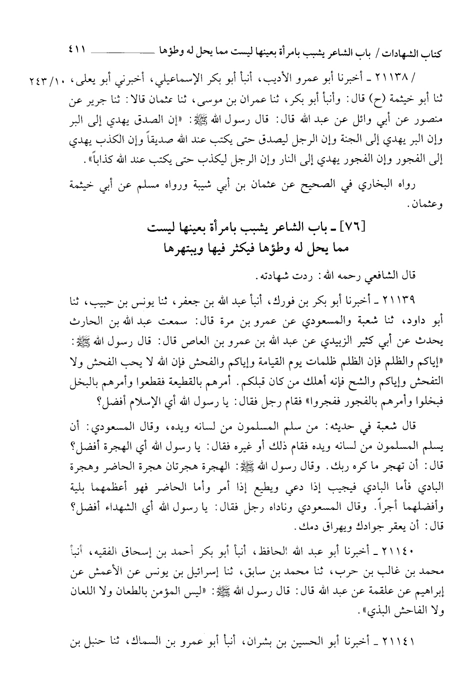 21138 - أَخْبَرَنَا أَبُو عَمْرٍو الْأَدِيبُ , أنبأ أَبُو بَكْرٍ الْإِسْمَاعِيلِيُّ , أَخْبَرَنِي أَبُو يَعْلَى , ثنا أَبُو خَيْثَمَةَ ح قَالَ: وَأنبأ أَبُو بَكْرٍ , ثنا عِمْرَانُ بْنُ مُوسَى , ثنا عُثْمَانُ , قَالَا: ثنا جَرِيرٌ , عَنْ مَنْصُورٍ , عَنْ أَبِي وَائِلٍ , عَنْ عَبْدِ اللهِ , قَالَ: قَالَ رَسُولُ اللهِ صَلَّى اللهُ عَلَيْهِ وَسَلَّمَ: §" إِنَّ الصِّدْقَ يَهْدِي إِلَى الْبِرِّ , وَإِنَّ الْبِرَّ يَهْدِي إِلَى الْجَنَّةِ , وَإِنَّ الرَّجُلَ لَيَصْدُقُ حَتَّى يُكْتَبَ عِنْدَ اللهِ صَدِّيقًا , وَإِنَّ الْكَذِبَ يَهْدِي إِلَى الْفُجُورِ , وَإِنَّ الْفُجُورَ يَهْدِي إِلَى النَّارِ , وَإِنَّ الرَّجُلَ لَيَكْذِبُ حَتَّى يُكْتَبَ عِنْدَ اللهِ كَذَّابًا " رَوَاهُ الْبُخَارِيُّ فِي الصَّحِيحِ عَنْ عُثْمَانَ بْنِ أَبِي شَيْبَةَ , وَرَوَاهُ مُسْلِمٌ عَنْ أَبِي خَيْثَمَةَ وَعُثْمَانَ