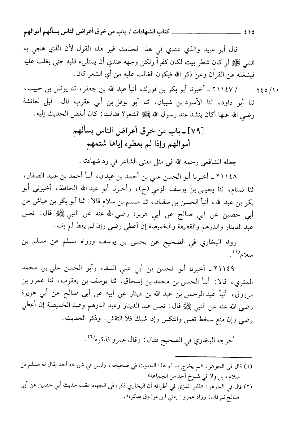 21148 - أَخْبَرَنَا أَبُو الْحَسَنِ عَلِيُّ بْنُ أَحْمَدَ بْنِ عَبْدَانَ، أنبأ أَحْمَدُ بْنُ عُبَيْدٍ الصَّفَّارُ، ثنا تَمْتَامٌ، ثنا يَحْيَى بْنُ يُوسُفَ الزِّمِّيُّ، ح وَأَخْبَرَنَا أَبُو عَبْدِ اللهِ الْحَافِظُ، أَخْبَرَنِي أَبُو بَكْرِ بْنُ عَبْدِ اللهِ، أنبأ الْحَسَنُ بْنُ سُفْيَانَ، ثنا مُسْلِمُ بْنُ سَلَّامٍ قَالَا: ثنا أَبُو بَكْرِ بْنُ عَيَّاشٍ، عَنْ أَبِي حُصَيْنٍ، عَنْ أَبِي صَالِحٍ، عَنْ أَبِي هُرَيْرَةَ رَضِيَ اللهُ عَنْهُ، عَنِ النَّبِيِّ صَلَّى اللهُ عَلَيْهِ وَسَلَّمَ قَالَ: " §تَعِسَ عَبْدُ الدِّينَارِ وَالدِّرْهَمِ وَالْقَطِيِفَةِ وَالْخُمَيْصَةِ، إِنْ أُعْطِيَ رَضِيَ، وَإِنْ لَمْ يُعْطَ لَمْ يَفِ " رَوَاهُ الْبُخَارِيُّ فِي الصَّحِيحِ، عَنْ يَحْيَى بْنِ يُوسُفَ، وَرَوَاهُ مُسْلِمٌ، عَنْ مُسْلِمِ بْنِ سَلَّامٍ
