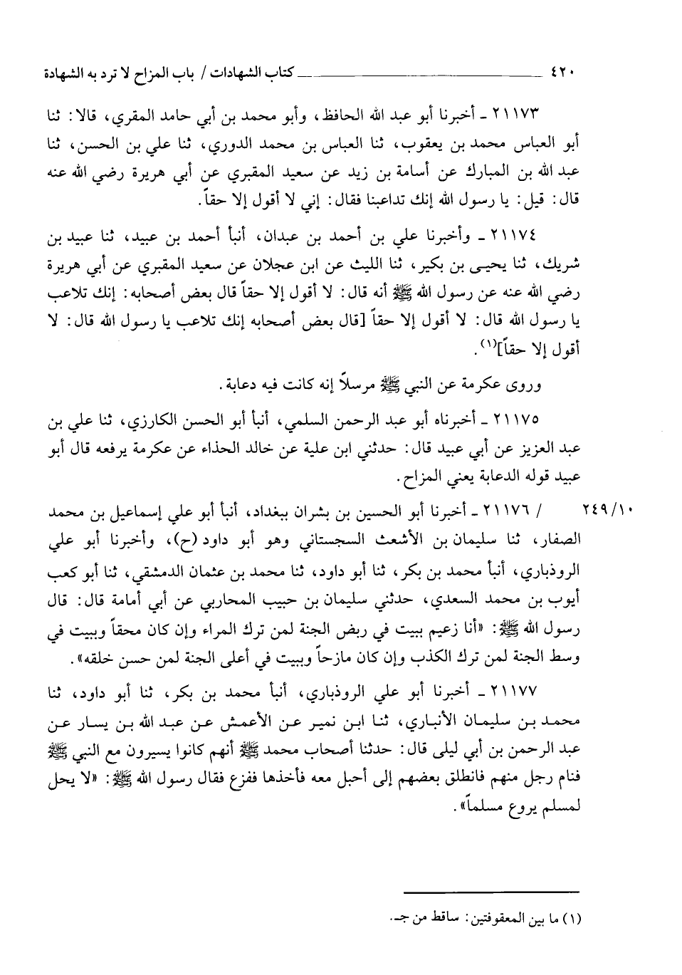 21173 - أَخْبَرَنَا أَبُو عَبْدِ اللهِ الْحَافِظُ , وَأَبُو مُحَمَّدِ بْنُ أَبِي حَامِدٍ الْمُقْرِئُ قَالَا: ثنا أَبُو الْعَبَّاسِ مُحَمَّدُ بْنُ يَعْقُوبَ , ثنا الْعَبَّاسُ بْنُ مُحَمَّدٍ الدُّورِيُّ , ثنا عَلِيُّ بْنُ الْحَسَنِ , ثنا عَبْدُ اللهِ بْنُ الْمُبَارَكِ , عَنْ أُسَامَةَ بْنِ زَيْدٍ , عَنْ سَعِيدٍ الْمَقْبُرِيِّ , عَنْ أَبِي هُرَيْرَةَ، رَضِيَ اللهُ عَنْهُ قَالَ: قِيلَ: يَا رَسُولَ اللهِ , إِنَّكَ تُدَاعِبُنَا , فَقَالَ: §" إِنِّي لَا أَقُولُ إِلَّا حَقًّا "