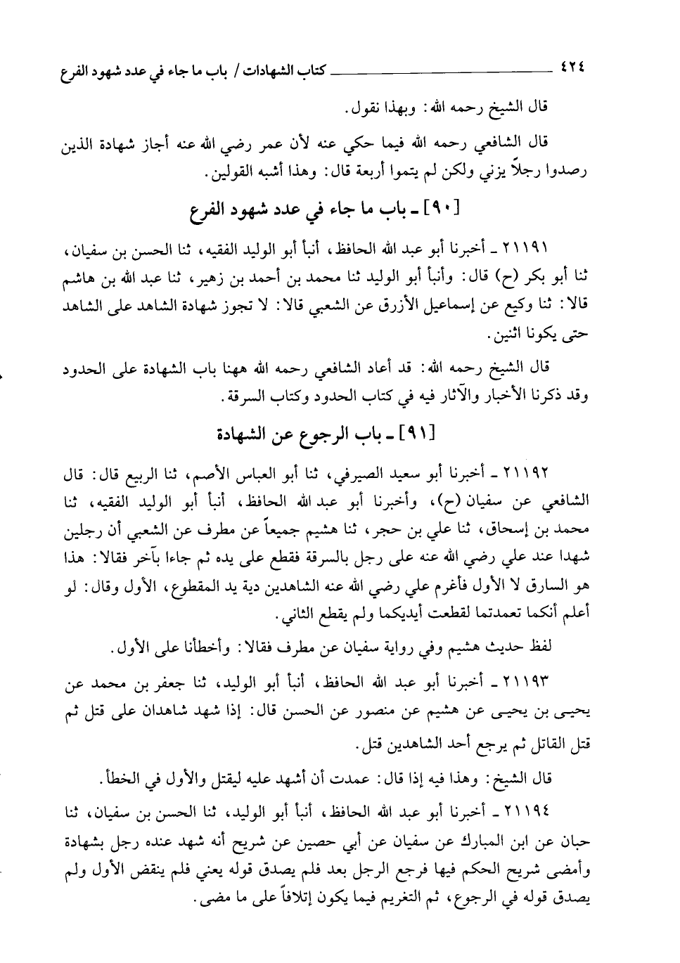 21191 - أَخْبَرَنَا أَبُو عَبْدِ اللهِ الْحَافِظُ , أنبأ أَبُو الْوَلِيدِ الْفَقِيهُ , ثنا الْحَسَنُ بْنُ سُفْيَانَ , ثنا أَبُو بَكْرٍ، ح، قَالَ: وَأنبأ أَبُو الْوَلِيدِ , ثنا مُحَمَّدُ بْنُ أَحْمَدَ بْنِ زُهَيْرٍ , ثنا عَبْدُ اللهِ بْنُ هَاشِمٍ، قَالَا: ثنا وَكِيعٌ , عَنْ إِسْمَاعِيلَ الْأَزْرَقِ , عَنِ الشَّعْبِيِّ قَالَ: §" لَا تَجُوزُ شَهَادَةٌ الَشَاهِدٍ عَلَى الشَّاهِدِ حَتَّى يَكُونَا اثْنَيْنِ ". قَالَ الشَّيْخُ رَحِمَهُ اللهُ: قَدْ أَعَادَ الشَّافِعِيُّ رَحِمَهُ اللهُ هَهُنَا بَابَ الشَّهَادَةِ عَلَى الْحُدُودِ , وَقَدْ ذَكَرْنَا الْأَخْبَارَ وَالْآثَارَ فِيهِ فِي كِتَابِ الْحُدُودِ وَكِتَابِ السَّرِقَةِ