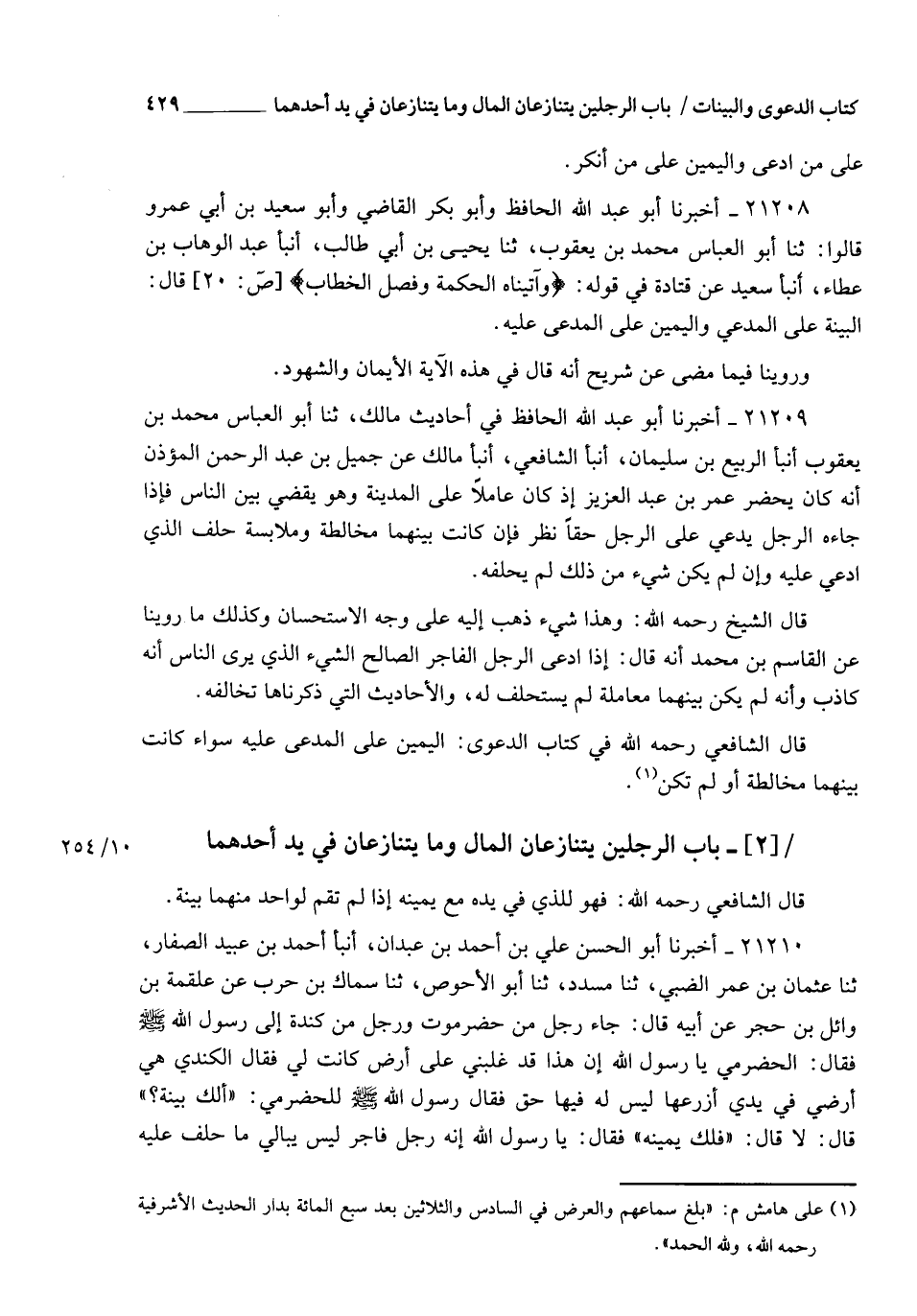 21210 - أَخْبَرَنَا أَبُو الْحَسَنِ عَلِيُّ بْنُ أَحْمَدَ بْنِ عَبْدَانَ , أنبأ أَحْمَدُ بْنُ عُبَيْدٍ الصَّفَّارُ , ثنا عُثْمَانُ بْنُ عُمَرَ الضَّبِّيُّ , ثنا مُسَدَّدٌ , ثنا أَبُو الْأَحْوَصِ , ثنا سِمَاكُ بْنُ حَرْبٍ , عَنْ عَلْقَمَةَ بْنِ وَائِلِ بْنِ حُجْرٍ , عَنْ أَبِيهِ، قَالَ: جَاءَ رَجُلٌ مِنْ حَضْرَمَوْتَ وَرَجُلٌ مِنْ كِنْدَةَ إِلَى رَسُولِ اللهِ صَلَّى اللهُ عَلَيْهِ وَسَلَّمَ , فَقَالَ الْحَضْرَمِيُّ: يَا رَسُولَ اللهِ , إِنَّ هَذَا قَدْ غَلَبَنِي عَلَى أَرْضٍ كَانَتْ لِي , فَقَالَ الْكِنْدِيُّ: هِيَ أَرْضِي فِيُ يَدِي , أَزْرَعُهَا , لَيْسَ لَهُ فِيهَا حَقٌّ , فَقَالَ رَسُولُ اللهِ صَلَّى اللهُ عَلَيْهِ وَسَلَّمَ لِلْحَضْرَمِيِّ: " أَلَكَ بَيِّنَةٌ "؟ قَالَ: لَا , قَالَ: " فَلَكَ يَمِينُهُ " , قَالَ: يَا رَسُولَ اللهِ , إِنَّهُ رَجُلٌ فَاجِرٌ لَيْسَ يُبَالِي مَا حَلَفَ عَلَيْهِ , -[430]- لَيْسَ يَتَوَرَّعُ مِنْ شَيْءٍ , فَقَالَ لَهُ النَّبِيُّ صَلَّى اللهُ عَلَيْهِ وَسَلَّمَ: " لَيْسَ لَكَ مِنْهُ إِلَّا ذَلِكَ " , فَانْطَلَقَ لِيَحْلِفَ , قَالَ: فَلَمَّا أَدْبَرَ الرَّجُلُ قَالَ رَسُولُ اللهِ صَلَّى اللهُ عَلَيْهِ وَسَلَّمَ: " أَمَا إِنَّهُ §إِنْ حَلَفَ عَلَى مَالٍ لِيَأْكُلَهُ ظُلْمًا لَقِيَ اللهَ وَهُوَ عَنْهُ مُعْرِضٌ " رَوَاهُ مُسْلِمٌ فِي الصَّحِيحِ عَنْ قُتَيْبَةَ , وَجَمَاعَةٍ , عَنْ أَبِي الْأَحْوَصِ