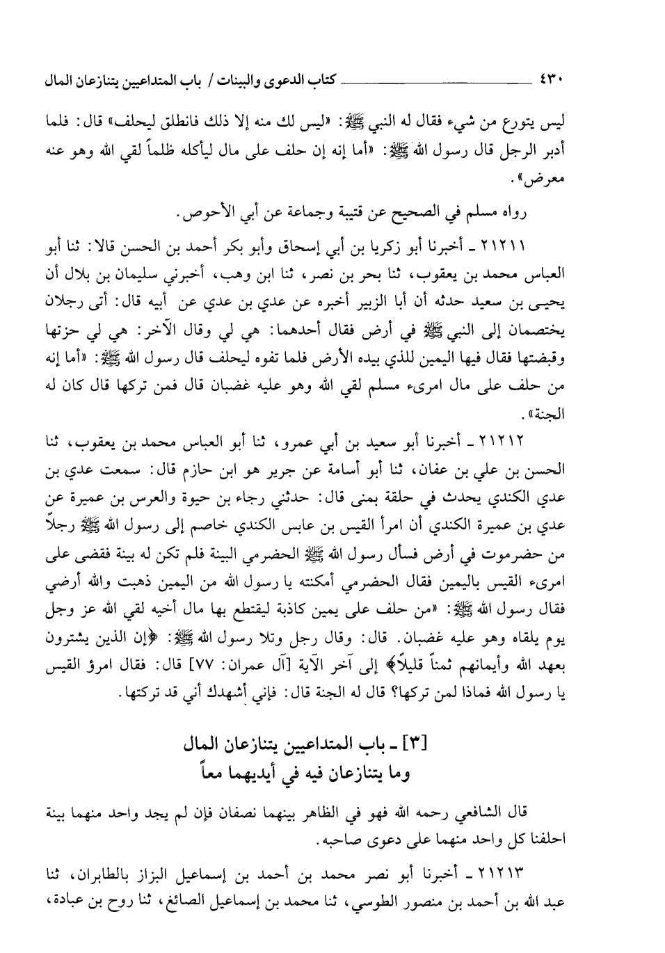 21212 - أَخْبَرَنَا أَبُو سَعِيدِ بْنُ أَبِي عَمْرٍو , ثنا أَبُو الْعَبَّاسِ مُحَمَّدُ بْنُ يَعْقُوبَ , ثنا الْحَسَنُ بْنُ عَلِيِّ بْنِ عَفَّانَ , ثنا أَبُو أُسَامَةَ , عَنْ جَرِيرٍ - هُوَ ابْنُ حَازِمٍ , قَالَ: سَمِعْتُ عَدِيَّ بْنَ عَدِيٍّ الْكِنْدِيَّ يُحَدِّثُ فِي حَلْقَةٍ بِمِنًى , قَالَ: حَدَّثَنِي رَجَاءُ بْنُ حَيْوَةَ وَالْعُرْسُ بْنُ عَمِيرَةَ عَنْ عَدِيِّ بْنِ عَمِيرَةَ الْكِنْدِيِّ أَنَّ امْرَأَ الْقَيْسِ بْنَ عَابِسٍ الْكِنْدِيَّ خَاصَمَ إِلَى رَسُولِ اللهِ صَلَّى اللهُ عَلَيْهِ وَسَلَّمَ رَجُلًا مِنْ حَضْرَمَوْتَ فِي أَرْضٍ , فَسَأَلَ رَسُولُ اللهِ صَلَّى اللهُ عَلَيْهِ وَسَلَّمَ الْحَضْرَمِيَّ الْبَيِّنَةَ , فَلَمْ تَكُنْ لَهُ بَيِّنَةٌ , فَقَضَى عَلَى امْرِئِ الْقَيْسِ بِالْيَمِينِ , فَقَالَ الْحَضْرَمِيُّ: أَمْكَنْتَهُ يَا رَسُولَ اللهِ مِنَ الْيَمِينِ ذَهَبَتْ وَاللهِ أَرْضِي , فَقَالَ رَسُولُ اللهِ صَلَّى اللهُ عَلَيْهِ وَسَلَّمَ: §" مَنْ حَلَفَ عَلَى يَمِينٍ كَاذِبَةٍ لِيَقْتَطِعَ بِهَا مَالَ أَخِيهِ لَقِيَ اللهَ عَزَّ وَجَلَّ يَوْمَ يَلْقَاهُ وَهُوَ عَلَيْهِ غَضْبَانُ " , قَالَ: وَقَالَ رَجُلٌ: وَتَلَا رَسُولُ اللهِ صَلَّى اللهُ عَلَيْهِ وَسَلَّمَ: {إِنَّ الَّذِينَ يَشْتَرُونَ بِعَهْدِ اللهِ وَأَيْمَانِهِمْ ثَمَنًا قَلِيلًا} [آل عمران: 77] إِلَى آخِرِ الْآيَةِ، قَالَ: فَقَالَ امْرُؤُ الْقَيْسِ: يَا رَسُولَ اللهِ , فَمَاذَا لِمَنْ تَرَكَهَا؟ قَالَ: " لَهُ الْجَنَّةُ " , قَالَ: فَإِنِّي أُشْهِدُكَ أَنِّي قَدْ تَرَكْتُهَا