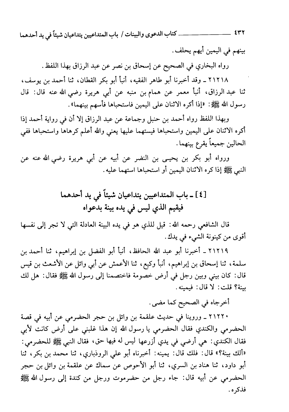 21220 - وَرُوِّينَا فِي حَدِيثِ عَلْقَمَةَ بْنِ وَائِلِ بْنِ حُجْرٍ الْحَضْرَمِيِّ عَنْ أَبِيهِ , فِي قِصَّةِ الْحَضْرَمِيِّ وَالْكِنْدِيِّ , فَقَالَ الْحَضْرَمِيُّ: يَا رَسُولَ اللهِ , إِنَّ هَذَا غَلَبَنِي عَلَى أَرْضٍ كَانَتْ لِأَبِي , فَقَالَ الْكِنْدِيُّ: هِيَ أَرْضِي فِي يَدِي , أَزْرَعُهَا , لَيْسَ لَهُ فِيهَا حَقٌّ , فَقَالَ النَّبِيُّ صَلَّى اللهُ عَلَيْهِ وَسَلَّمَ لِلْحَضْرَمِيِّ: " §أَلَكَ بَيِّنَةٌ "؟ قَالَ: لَا , قَالَ: " فَلَكَ يَمِينُهُ " أَخْبَرَنَاهُ أَبُو عَلِيٍّ الرُّوذْبَارِيُّ , ثنا مُحَمَّدُ بْنُ بَكْرٍ , ثنا أَبُو دَاوُدَ , ثنا هَنَّادُ بْنُ السَّرِيِّ , ثنا أَبُو الْأَحْوَصِ , عَنْ سِمَاكٍ , عَنْ عَلْقَمَةَ بْنِ وَائِلِ بْنِ حُجْرٍ الْحَضْرَمِيِّ , عَنْ أَبِيهِ قَالَ: جَاءَ رَجُلٌ مِنْ حَضْرَمَوْتَ , وَرَجُلٌ مِنْ كِنْدَةَ إِلَى رَسُولِ اللهِ صَلَّى اللهُ عَلَيْهِ وَسَلَّمَ , فَذَكَرَهُ. -[433]- أَخْرَجَهُ مُسْلِمٌ فِي الصَّحِيحِ عَنْ هَنَّادٍ
