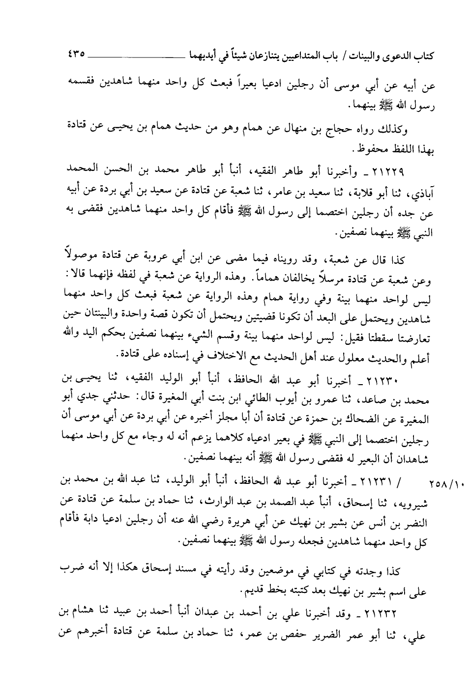 21231 - أَخْبَرَنَا أَبُو عَبْدِ اللهِ الْحَافِظُ , أنبأ أَبُو الْوَلِيدِ , ثنا عَبْدُ اللهِ بْنُ مُحَمَّدِ بْنِ شِيرَوَيْهِ , ثنا إِسْحَاقُ , أنبأ عَبْدُ الصَّمَدِ بْنُ عَبْدِ الْوَارِثِ , ثنا حَمَّادُ بْنُ سَلَمَةَ , عَنْ قَتَادَةَ , عَنِ النَّضْرِ بْنِ أَنَسٍ , عَنْ بَشِيرِ بْنِ نَهِيكٍ , عَنْ أَبِي هُرَيْرَةَ، رَضِيَ اللهُ عَنْهُ أَنَّ رَجُلَيْنِ ادَّعَيَا دَابَّةً , فَأَقَامَ كُلُّ وَاحِدٍ مِنْهُمَا شَاهِدَيْنِ , §فَجَعَلَهُ رَسُولُ اللهِ صَلَّى اللهُ عَلَيْهِ وَسَلَّمَ بَيْنَهُمَا نِصْفَيْنِ كَذَا وَجَدْتُهُ فِي كِتَابِي فِي مَوْضِعَيْنِ , وَقَدْ رَأَيْتُهُ فِي مُسْنَدِ إِسْحَاقَ هَكَذَا , إِلَّا أَنَّهُ ضَرَبَ عَلَى اسْمِ بَشِيرِ بْنِ نَهِيكٍ بَعْدَ كِتَابَتِهِ بِخَطٍّ قَدِيمٍ