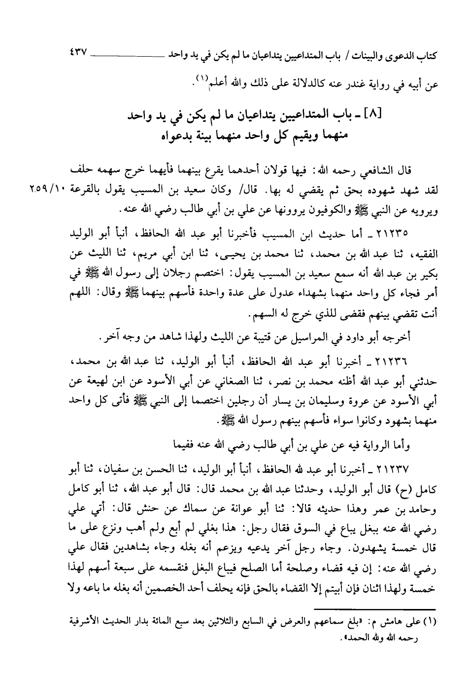 21237 - أَخْبَرَنَا أَبُو عَبْدِ اللهِ الْحَافِظُ , أنبأ أَبُو الْوَلِيدِ , ثنا الْحَسَنُ بْنُ سُفْيَانَ , ثنا أَبُو كَامِلٍ ح قَالَ أَبُو الْوَلِيدِ: وَحَدَّثَنَا عَبْدُ اللهِ بْنُ مُحَمَّدٍ قَالَ: قَالَ أَبُو عَبْدِ اللهِ: ثنا أَبُو كَامِلٍ , وَحَامِدُ بْنُ عُمَرَ , وَهَذَا حَدِيثُهُ , قَالَا: ثنا أَبُو عَوَانَةَ , عَنْ سِمَاكٍ , عَنْ حَنَشٍ قَالَ: أُتِيَ عَلِيٌّ رَضِيَ اللهُ عَنْهُ بِبَغْلٍ يُبَاعُ فِي السُّوقِ , فَقَالَ رَجُلٌ: هَذَا بَغْلِي , لَمْ أَبِعْ , وَلَمْ أَهَبْ , وَنَزَعَ عَلَى مَا قَالَ خَمْسَةٌ يَشْهَدُونَ , وَجَاءَ رَجُلٌ آخَرُ يَدَّعِيهِ وَيَزْعُمُ أَنَّهُ بَغْلُهُ , وَجَاءَ بِشَاهِدَيْنِ , فَقَالَ عَلِيٌّ رَضِيَ اللهُ عَنْهُ: " §إِنَّ فِيهِ قَضَاءً وَصُلْحَةً , أَمَّا الصُّلْحُ: فَيُبَاعُ الْبَغْلُ فَنُقَسِّمُهُ عَلَى سَبْعَةِ أَسْهُمٍ , لِهَذَا خَمْسَةٌ , وَلِهَذَا اثْنَانِ , فَإِنْ أَبَيْتُمْ إِلَّا الْقَضَاءَ بِالْحَقِّ , فَإِنَّهُ يَحْلِفُ أَحَدُ الْخَصْمَيْنِ أَنَّهُ بَغْلُهُ , مَا بَاعَهُ وَلَا -[438]- وَهَبَهُ , فَإِنْ تَشَاحَحْتُمَا أَيُّكُمَا يَحْلِفُ أَقْرَعْتُ بَيْنَكُمَا عَلَى الْحَلِفِ , فَأَيُّكُمَا قَرَعَ حَلَفَ " , فَقَضَى بِهَذَا وَأَنَا شَاهِدٌ. وَقَدْ رُوِيَ فِيهِ عَنْ أَبِي هُرَيْرَةَ , رَفَعَهُ , مَا: