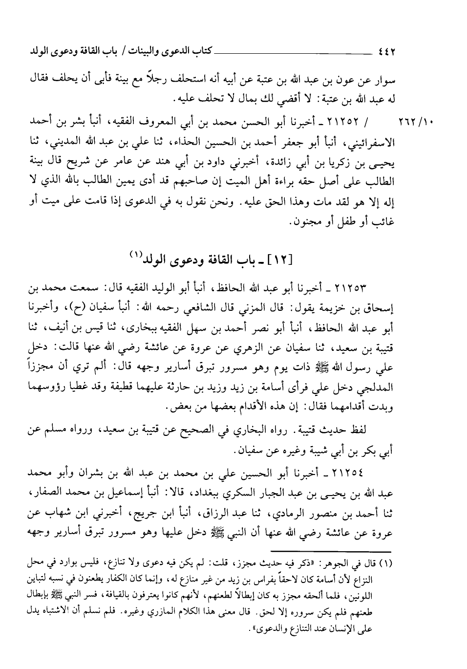 21253 - أَخْبَرَنَا أَبُو عَبْدِ اللهِ الْحَافِظُ , أنبأ أَبُو الْوَلِيدِ الْفَقِيهُ، قَالَ: سَمِعْتُ مُحَمَّدَ بْنَ إِسْحَاقَ بْنِ خُزَيْمَةَ يَقُولُ: قَالَ الْمُزَنِيُّ: قَالَ الشَّافِعِيُّ رَحِمَهُ اللهُ: أنبأ سُفْيَانُ ح وَأَخْبَرَنَا أَبُو عَبْدِ اللهِ الْحَافِظُ , أنبأ أَبُو نَصْرٍ أَحْمَدُ بْنُ سَهْلٍ الْفَقِيهُ بِبُخَارَا , ثنا قَيْسُ بْنُ أُنَيْفٍ , ثنا قُتَيْبَةُ بْنُ سَعِيدٍ , ثنا سُفْيَانُ، عَنِ الزُّهْرِيِّ، عَنْ عُرْوَةَ، عَنْ عَائِشَةَ رَضِيَ اللهُ عَنْهَا قَالَتْ: دَخَلَ عَلَيَّ رَسُولُ اللهِ صَلَّى اللهُ عَلَيْهِ وَسَلَّمَ ذَاتَ يَوْمٍ وَهُوَ مَسْرُورٌ تَبْرُقُ أَسَارِيرُ وَجْهِهِ , قَالَ: أَلَمْ تَرَيْ أَنَّ مُجَزِّزًا الْمُدْلِجِيَّ دَخَلَ عَلَيَّ , فَرَأَى أُسَامَةَ بْنَ زَيْدٍ , وَزَيْدَ بْنَ حَارِثَةَ عَلَيْهِمَا قَطِيفَةٌ , وَقَدْ غَطَّيَا رُءُوسَهُمَا وَبَدَتْ أَقْدَامُهُمَا، فَقَالَ: §" إِنَّ هَذِهِ الْأَقْدَامَ بَعْضُهَا مِنْ بَعْضٍ ". لَفْظُ حَدِيثِ قُتَيْبَةَ , رَوَاهُ الْبُخَارِيُّ فِي الصَّحِيحِ، عَنْ قُتَيْبَةَ بْنِ سَعِيدٍ , وَرَوَاهُ مُسْلِمٌ، عَنْ أَبِي بَكْرِ بْنِ أَبِي شَيْبَةَ وَغَيْرِهِ، عَنْ سُفْيَانَ