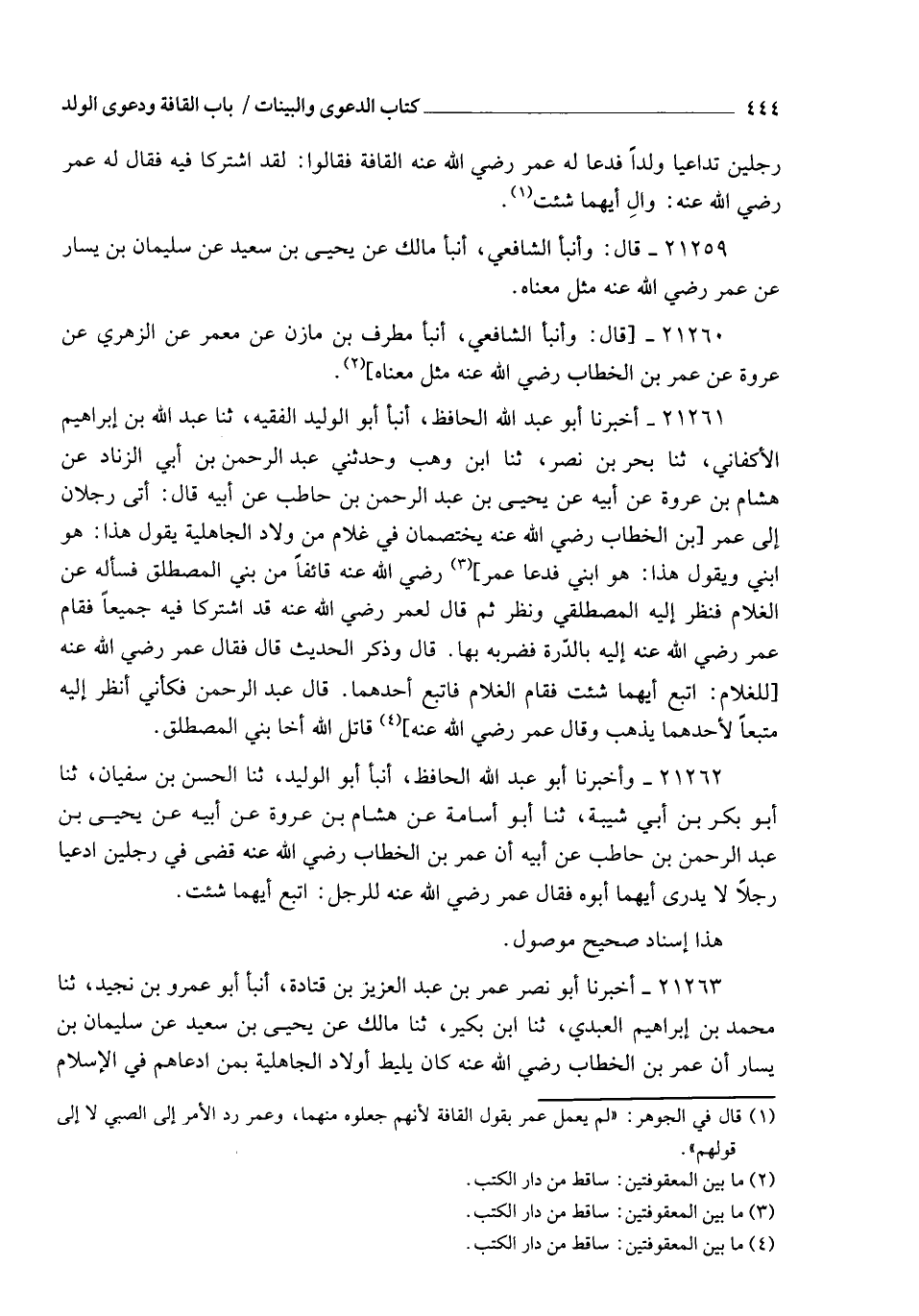 21262 - وَأَخْبَرَنَا أَبُو عَبْدِ اللهِ الْحَافِظُ , أنبأ أَبُو الْوَلِيدِ , ثنا الْحَسَنُ بْنُ سُفْيَانَ , ثنا أَبُو بَكْرِ بْنُ أَبِي شَيْبَةَ , ثنا أَبُو أُسَامَةَ , عَنْ هِشَامِ بْنِ عُرْوَةَ , عَنْ أَبِيهِ , عَنْ يَحْيَى بْنِ عَبْدِ الرَّحْمَنِ بْنِ حَاطِبٍ , عَنْ أَبِيهِ , أَنَّ عُمَرَ بْنَ الْخَطَّابِ، رَضِيَ اللهُ عَنْهُ قَضَى فِي رَجُلَيْنِ ادَّعَيَا رَجُلًا لَا يَدْرِي , أَيُّهُمَا أَبُوهُ، فَقَالَ عُمَرُ رَضِيَ اللهُ عَنْهُ لِلرَّجُلِ: §" اتْبَعْ أَيَّهُمَا شِئْتَ ". هَذَا إِسْنَادٌ صَحِيحٌ مَوْصُولٌ.