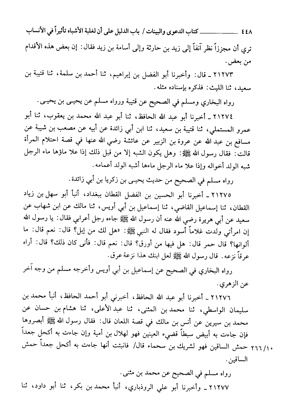 21274 - أَخْبَرَنَا أَبُو عَبْدِ اللهِ الْحَافِظُ , ثنا أَبُو عَبْدِ اللهِ مُحَمَّدُ بْنُ يَعْقُوبَ , ثنا أَبُو عَمْرٍو الْمُسْتَمْلِي , ثنا قُتَيْبَةُ بْنُ سَعِيدٍ , ثنا ابْنُ أَبِي زَائِدَةَ , عَنْ أَبِيهِ , عَنْ مُصْعَبِ بْنِ شَيْبَةَ , عَنْ مُسَافِعِ بْنِ عَبْدِ اللهِ , عَنْ عُرْوَةَ بْنِ الزُّبَيْرِ , عَنْ عَائِشَةَ، رَضِيَ اللهُ عَنْهَا فِي قِصَّةِ احْتِلَامِ الْمَرْأَةِ , قَالَتْ: فَقَالَ رَسُولُ اللهِ صَلَّى اللهُ عَلَيْهِ وَسَلَّمَ: §" وَهَلْ يَكُونُ الشَّبَهُ إِلَّا مِنْ قِبَلِ ذَلِكَ؟ إِذَا عَلَا مَاؤُهَا مَاءَ الرَّجُلِ أَشَبَهَ الْوَلَدُ أَخْوَالَهُ , وَإِذَا عَلَا مَاءُ الرَّجُلِ مَاءَهَا أَشْبَهَ الْوَلَدُ أَعْمَامَهُ ". رَوَاهُ مُسْلِمٌ فِي الصَّحِيحِ مِنْ حَدِيثِ يَحْيَى بْنِ زَكَرِيَّا بْنِ أَبِي زَائِدَةَ