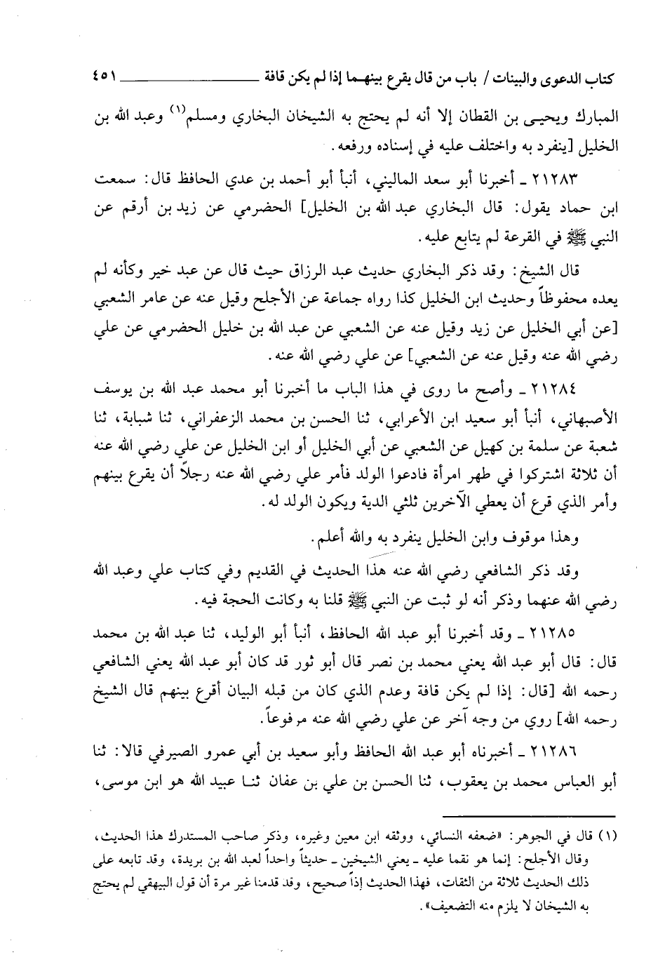 21284 - وَأَصَحُّ مَا رُوِيَ فِي هَذَا الْبَابِ مَا: أَخْبَرَنَا أَبُو مُحَمَّدٍ عَبْدُ اللهِ بْنُ يُوسُفَ الْأَصْبَهَانِيُّ , أنبأ أَبُو سَعِيدِ بْنُ الْأَعْرَابِيِّ , ثنا الْحَسَنُ بْنُ مُحَمَّدٍ الزَّعْفَرَانِيُّ , ثنا شَبَابَةُ , ثنا شُعْبَةُ , عَنْ سَلَمَةَ بْنِ كُهَيْلٍ , عَنِ الشَّعْبِيِّ , عَنْ أَبِي الْخَلِيلِ , أَوِ ابْنِ الْخَلِيلِ، عَنْ عَلِيٍّ، رَضِيَ اللهُ عَنْهُ , أَنَّ ثَلَاثَةً اشْتَرَكُوا فِي طُهْرِ امْرَأَةٍ , فَادَّعَوَا الْوَلَدَ , §فَأَمَرَ عَلِيٌّ رَضِيَ اللهُ عَنْهُ رَجُلًا أَنْ يُقْرِعَ بَيْنَهُمْ , وَأَمَرَ الَّذِي قَرَعَ أَنْ يُعْطِيَ الْآخَرِينَ ثُلُثَيِ الدِّيَةِ , وَيَكُونَ الْوَلَدُ لَهُ , وَهَذَا مَوْقُوفٌ. وَابْنُ الْخَلِيلِ يَنْفَرِدُ بِهِ , وَاللهُ أَعْلَمُ. وَقَدْ ذَكَرَ الشَّافِعِيُّ رَضِيَ اللهُ عَنْهُ هَذَا الْحَدِيثَ فِي الْقَدِيمِ وَفِي كِتَابِ عَلِيٍّ , وَعَبْدِ اللهِ رَضِيَ اللهُ عَنْهُمَا , وَذَكَرَ أَنَّهُ لَوْ ثَبَتَ عَنِ النَّبِيِّ صَلَّى اللهُ عَلَيْهِ وَسَلَّمَ قُلْنَا بِهِ , وَكَانَتِ الْحُجَّةُ فِيهِ.