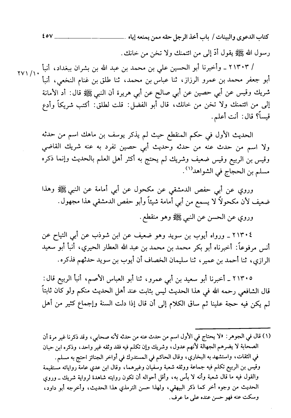 21305 - أَخْبَرَنَا أَبُو سَعِيدِ بْنُ أَبِي عَمْرٍو ثنا أَبُو الْعَبَّاسِ الْأَصَمُّ أَنْبَأَ الرَّبِيعُ، قَالَ: قَالَ الشَّافِعِيُّ رَحِمَهُ اللهُ فِي هَذَا الْحَدِيثِ: " لَيْسَ بِثَابِتٍ عِنْدَ أَهْلِ الْحَدِيثِ مِنْكُمْ , وَلَوْ كَانَ ثَابِتًا لَمْ يَكُنْ فِيهِ حُجَّةٌ عَلَيْنَا , ثُمَّ سَاقَ الْكَلَامَ إِلَى أَنْ قَالَ: إِذَا دَلَّتِ السُّنَّةُ وَإِجْمَاعُ كَثِيرٍ مِنْ أَهْلِ -[458]- الْعِلْمِ عَلَى أَنْ يَأْخُذَ الرَّجُلُ حَقَّهُ لِنَفْسِهِ سِرًّا مِنَ الَّذِي هُوَ عَلَيْهِ فَقَدْ دَلَّ أَنَّ ذَلِكَ لَيْسَ بِخِيَانَةٍ , الْخِيَانَةُ أَخْذُ مَا لَا يَحِلُّ أَخْذُهُ , فَلَوْ خَانَنِي دِرْهَمًا فَقُلْتُ: قَدِ اسْتَحَلَّ خِيَانَتِي , لَمْ يَكُنْ لِي أَنْ آخُذَ مِنْهُ عَشَرَةَ دَرَاهِمَ مُكَافَأَةً بِخِيَانَتِهِ لِي , وَكَانَ لِي أَنْ آخُذَ دِرْهَمًا , وَلَا أَكُونَ بِهَذَا خَائِنًا ظَالِمًا كَمَا كُنْتُ خَائِنًا ظَالِمًا بِأَخْذِ تِسْعَةٍ مَعَ دِرْهَمِي , لِأَنَّهُ لَمْ يَخُنْهَا "