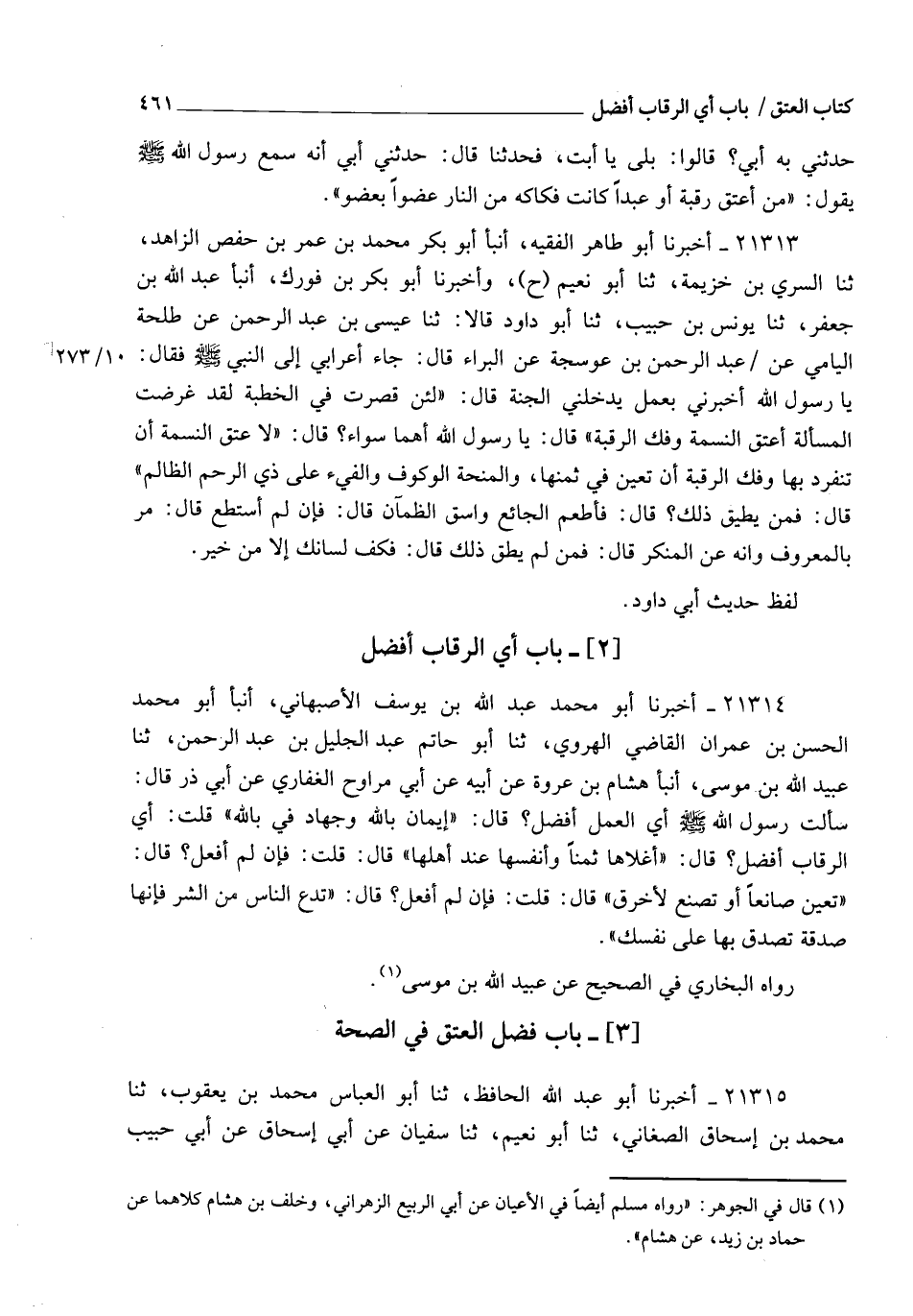21314 - أَخْبَرَنَا أَبُو مُحَمَّدٍ عَبْدُ اللهِ بْنُ يُوسُفَ الْأَصْبَهَانِيُّ , أنبأ أَبُو مُحَمَّدٍ الْحَسَنُ بْنُ عِمْرَانَ الْقَاضِي الْهَرَوِيُّ , ثنا أَبُو حَاتِمٍ عَبْدُ الْجَلِيلِ بْنُ عَبْدِ الرَّحْمَنِ , ثنا عُبَيْدُ اللهِ بْنُ مُوسَى , أنبأ هِشَامُ بْنُ عُرْوَةَ , عَنْ أَبِيهِ , عَنْ أَبِي مُرَاوِحٍ الْغِفَارِيِّ , عَنْ أَبِي ذَرٍّ، قَالَ: سَأَلْتُ رَسُولَ اللهِ صَلَّى اللهُ عَلَيْهِ وَسَلَّمَ: أِيُّ الْعَمَلِ أَفْضَلُ؟ قَالَ: §" إِيمَانٌ بِاللهِ , وَجِهَادٌ فِي سَبِيلِ اللهِ " , قُلْتُ: أِيُّ الرِّقَابِ أَفْضَلُ؟ قَالَ: " أَغْلَاهَا ثَمَنًا , وَأَنْفَسُهَا عِندَ أَهْلِهَا " , قَالَ: قُلْتُ: فَإِنْ لَمْ أَفْعَلْ؟ قَالَ: " تُعِينُ صَانِعًا , أَوْ تَصْنَعُ لِأَخْرَقَ " , قَالَ: قُلْتُ: فَإِنْ لَمْ أَفْعَلْ؟ قَالَ: " تَدَعُ النَّاسَ مِنَ الشَّرِّ , فَإِنَّهَا صَدَقَةٌ تَصَدَّقُ بِهَا عَلَى نَفْسِكَ " رَوَاهُ الْبُخَارِيُّ فِي الصَّحِيحِ عَنْ عُبَيْدِ اللهِ بْنِ مُوسَى