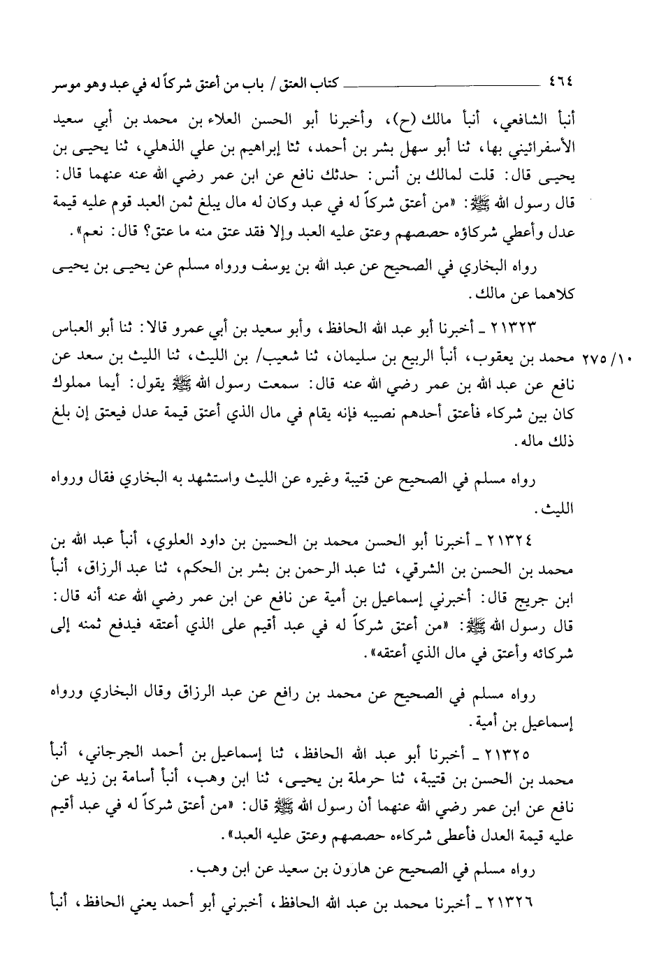 21325 - أَخْبَرَنَا أَبُو عَبْدِ اللهِ الْحَافِظُ , ثنا إِسْمَاعِيلُ بْنُ أَحْمَدَ الْجُرْجَانِيُّ , أنبأ مُحَمَّدُ بْنُ الْحَسَنِ بْنِ قُتَيْبَةَ , ثنا حَرْمَلَةُ بْنُ يَحْيَى , ثنا ابْنُ وَهْبٍ , أنبأ أُسَامَةُ بْنُ زَيْدٍ , عَنْ نَافِعٍ , عَنِ ابْنِ عُمَرَ، رَضِيَ اللهُ عَنْهُمَا , أَنَّ رَسُولَ اللهِ صَلَّى اللهُ عَلَيْهِ وَسَلَّمَ قَالَ: §" مَنْ أَعْتَقَ شِرْكًا لَهُ فِي عَبْدٍ أُقِيمَ عَلَيْهِ قِيمَةَ الْعَدْلِ , فَأَعْطَى شُرَكَاءَهُ حِصَصَهُمْ , وَعَتَقَ عَلَيْهِ الْعَبْدُ " رَوَاهُ مُسْلِمٌ فِي الصَّحِيحِ عَنْ هَارُونَ بْنِ سَعِيدٍ، عَنِ ابْنِ وَهْبٍ